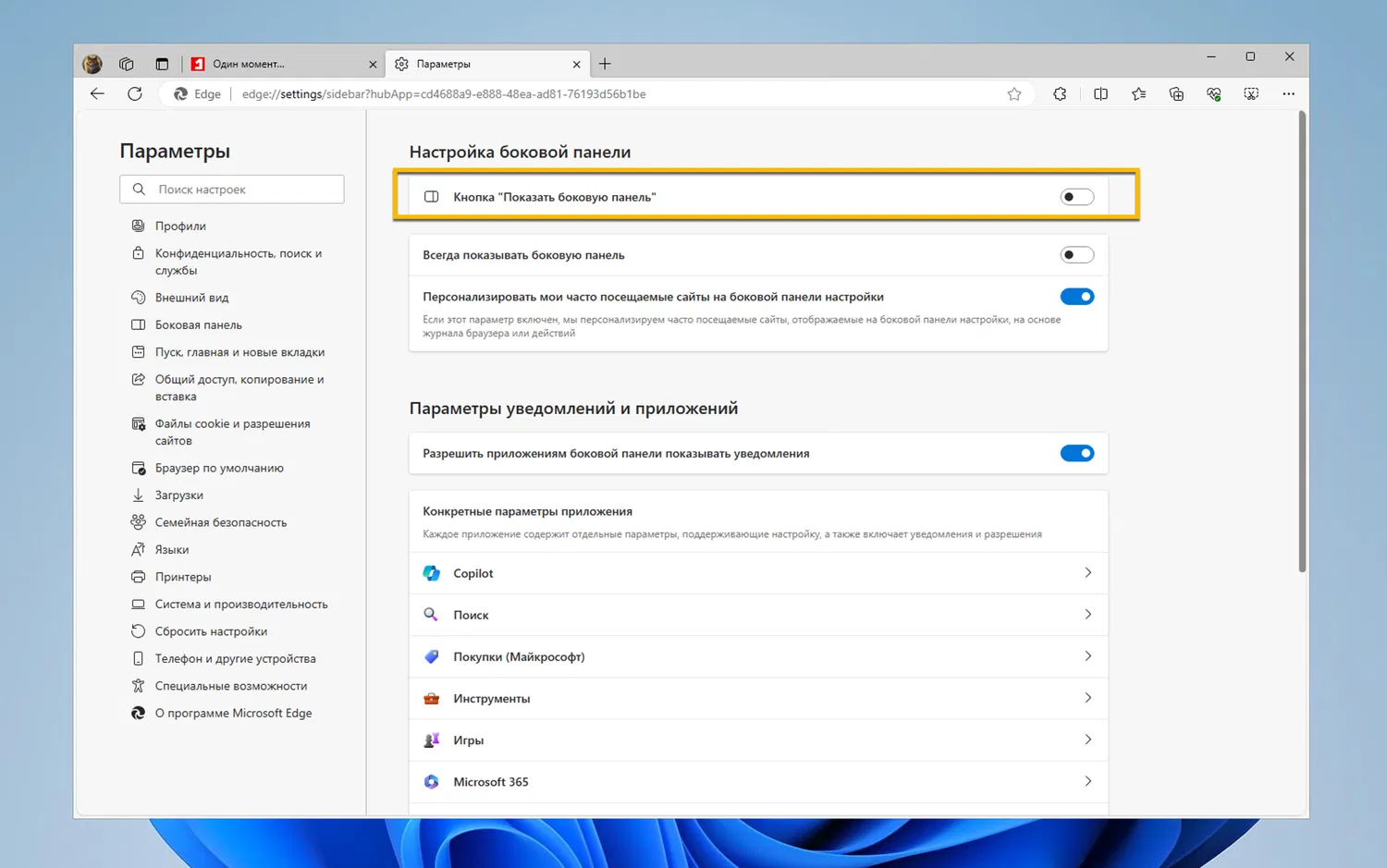 Данная опция не появится, пока вы не отключите кнопку Copilot в меню Параметры > Боковая панель > Copilot > Показать Copilot.