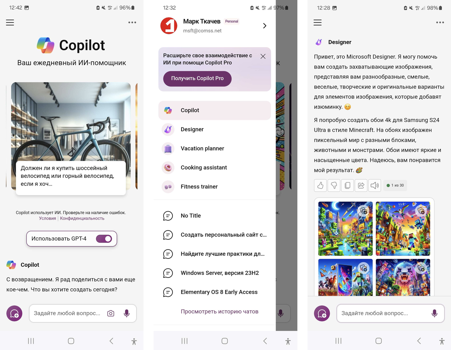 Четыре чат-бота Copilot обозначены как «Дизайнер» (Designer), «Планировщик отпуска» (Vacation Planner), «Помощник по кулинарии» (Cooking Assistant) и «Тренер по фитнесу» (Fitness Trainer). Пользователи Copilot могут выбрать модуль, задать вопросы по конкретной тематике и получить более точный и конкретный ответ, чем при использовании обычного чат-бота Copilot.