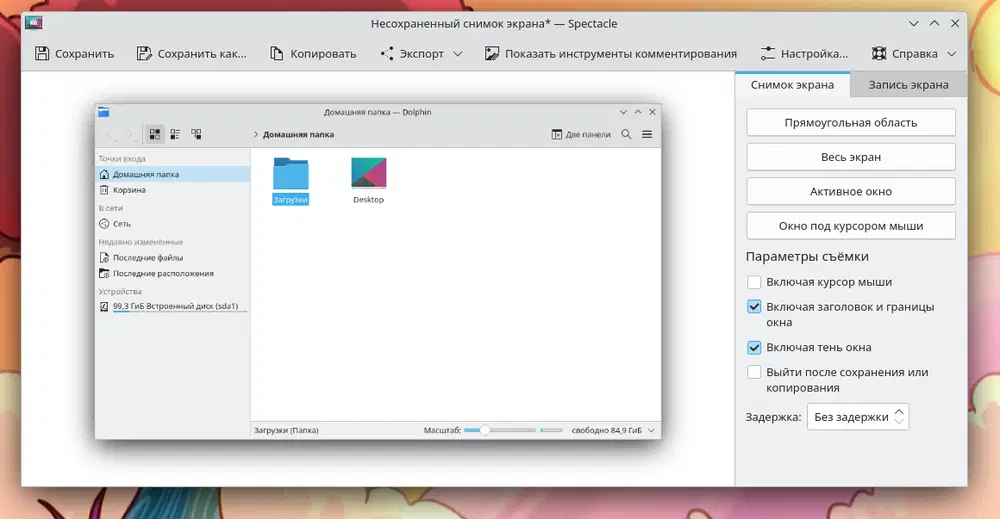 Утилита создания снимков экрана Spectacle также значительно расширила возможности записи экрана. Теперь пользователи заметят значок на панели задач, который появляется во время сеансов записи, предоставляя удобный способ контролировать продолжительность своих записей с помощью простого наведения курсора мыши.
