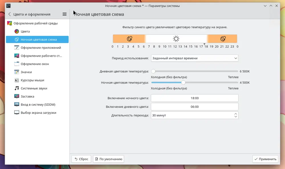 - Улучшенная Ночная цветовая схема: Раздел "Ночная цветовая схема" в настройках была усовершенствован и теперь включает полезное графическое отображение времени его активности и неактивности, включая время перехода.