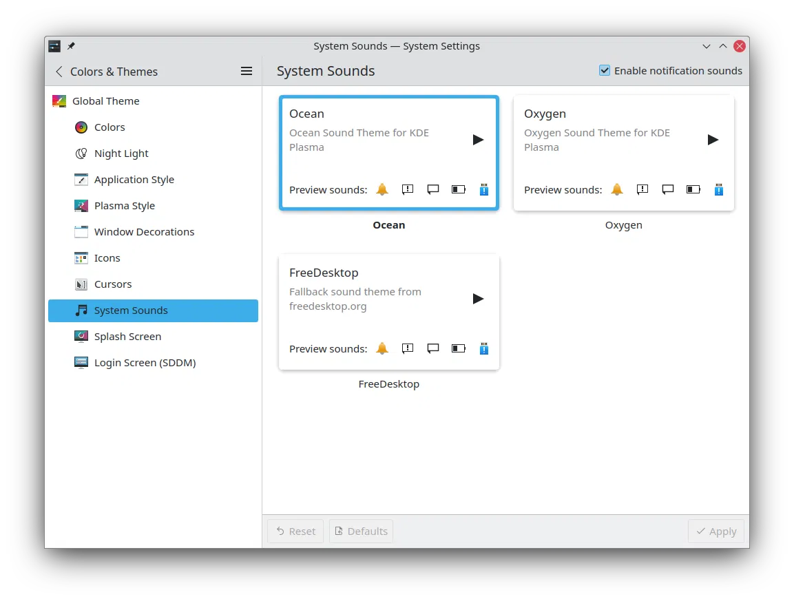 В Plasma 6.0 настройки системы были обновлены, чтобы включить новую страницу для выбора предпочитаемой звуковой темы.