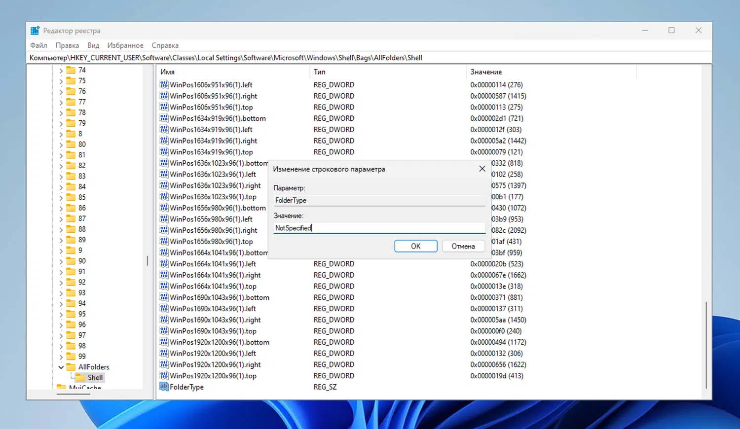 Компьютер\HKEY_CURRENT_USER\Software\Classes\Local Settings\Software\Microsoft\Windows\Shell\Bags\AllFolders\Shell