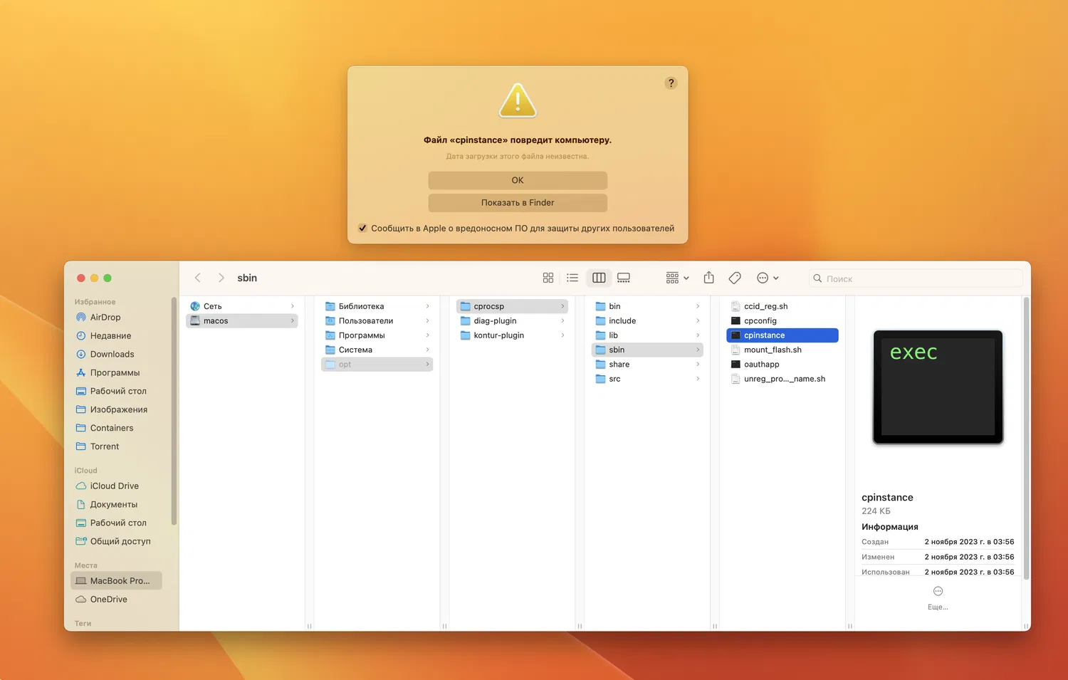 Файл «cpinstance» повредит компьютеру. Дата загрузки этого файла неизвестна. Сообщить в Apple о вредоносном ПО для защиты других пользователей