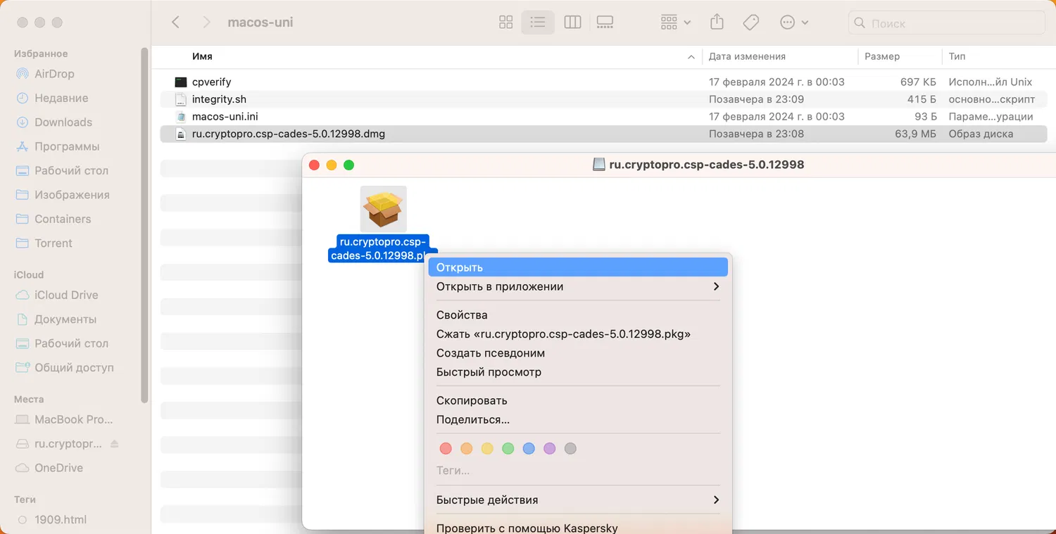 После распаковки у вас появится папка с названием «macos-uni». В этой папке нажмите правой кнопкой мыши на файле ru.cryptopro.csp-cades-5.0.12998.pkg и выберите «Открыть».