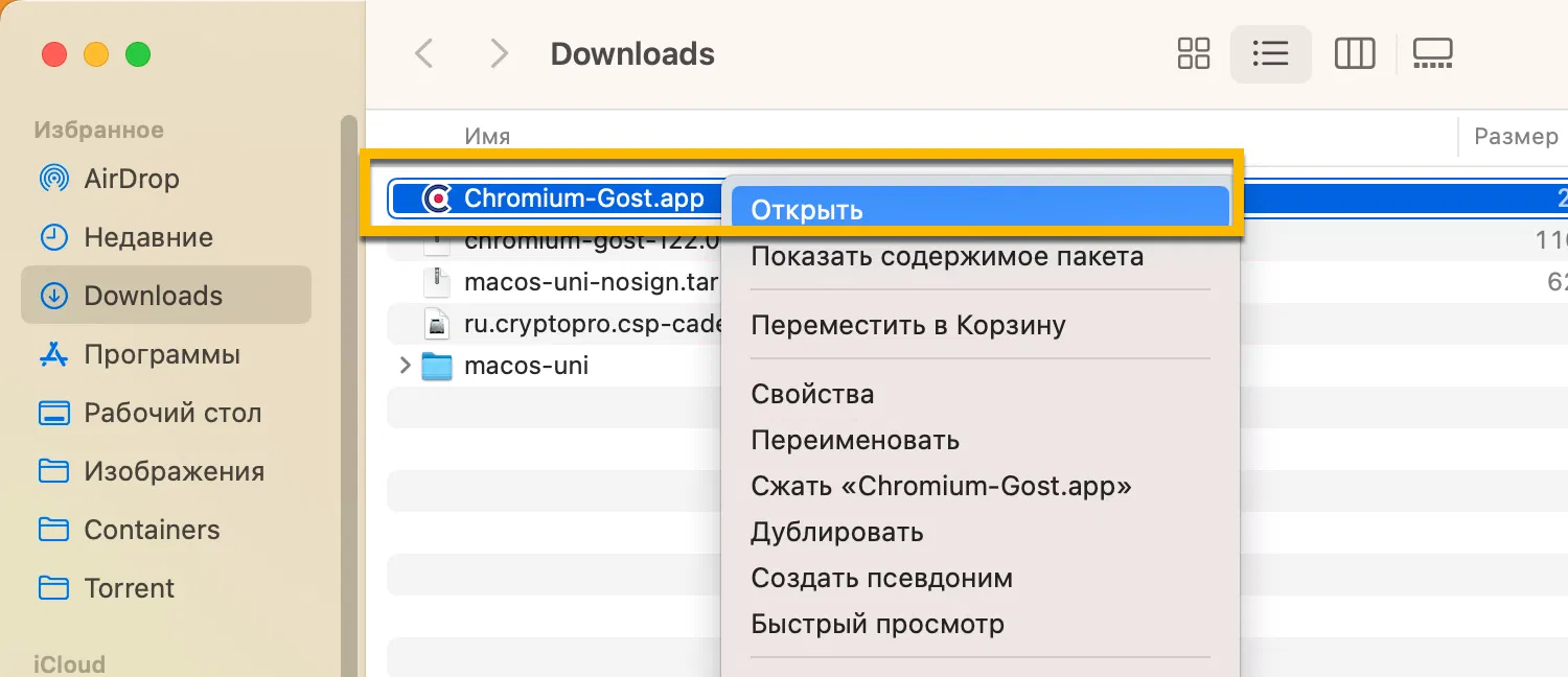 После скачивания, нажмите правой кнопкой мыши на файле браузера Chromium-Gost.app и выберите «Открыть».