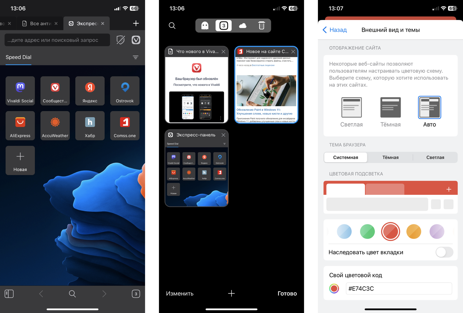 В новой версии Vivaldi 6.6 для iOS появились красочные темы, позволяющие пользователю адаптировать браузер под свои эстетические предпочтения, включая возможность установки любимого цвета в качестве темы. Также добавлена функция принудительного включения темного режима на неподдерживаемых веб-страницах. Улучшены блокировщик рекламы и трекеров, оптимизировано открытие ссылок на фоновых вкладках и обмен ссылками. Пользователи могут персонализировать свой интерфейс через Экспресс-панель и обои.