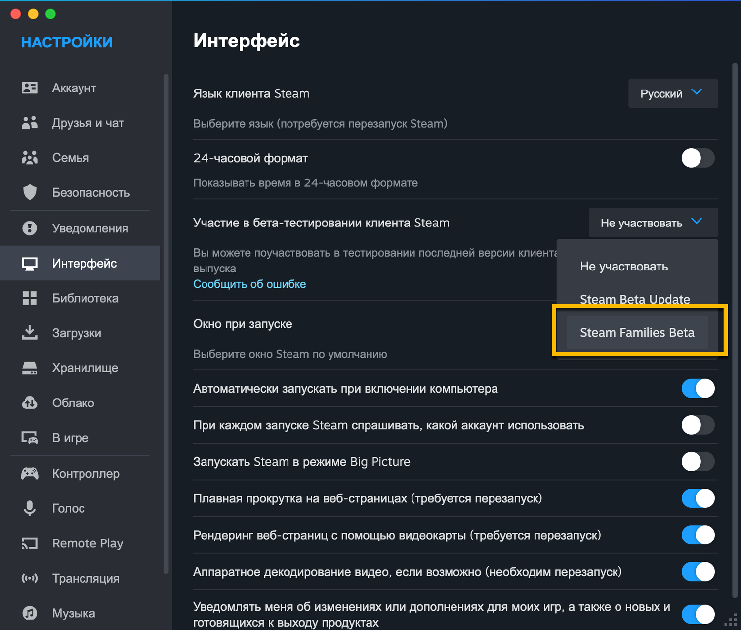 Сейчас функция Steam Families доступна в бета-клиенте Steam. Вы можете создавать семьи Steam и управлять ими с помощью клиента Steam на своем ПК, в веб-браузере или в мобильном приложении на телефоне. Перейдите в Steam > Настройки > Интерфейс > Участие в бета-тестировании клиента Steam > Steam Families Beta, чтобы принять участие в бета-программе.