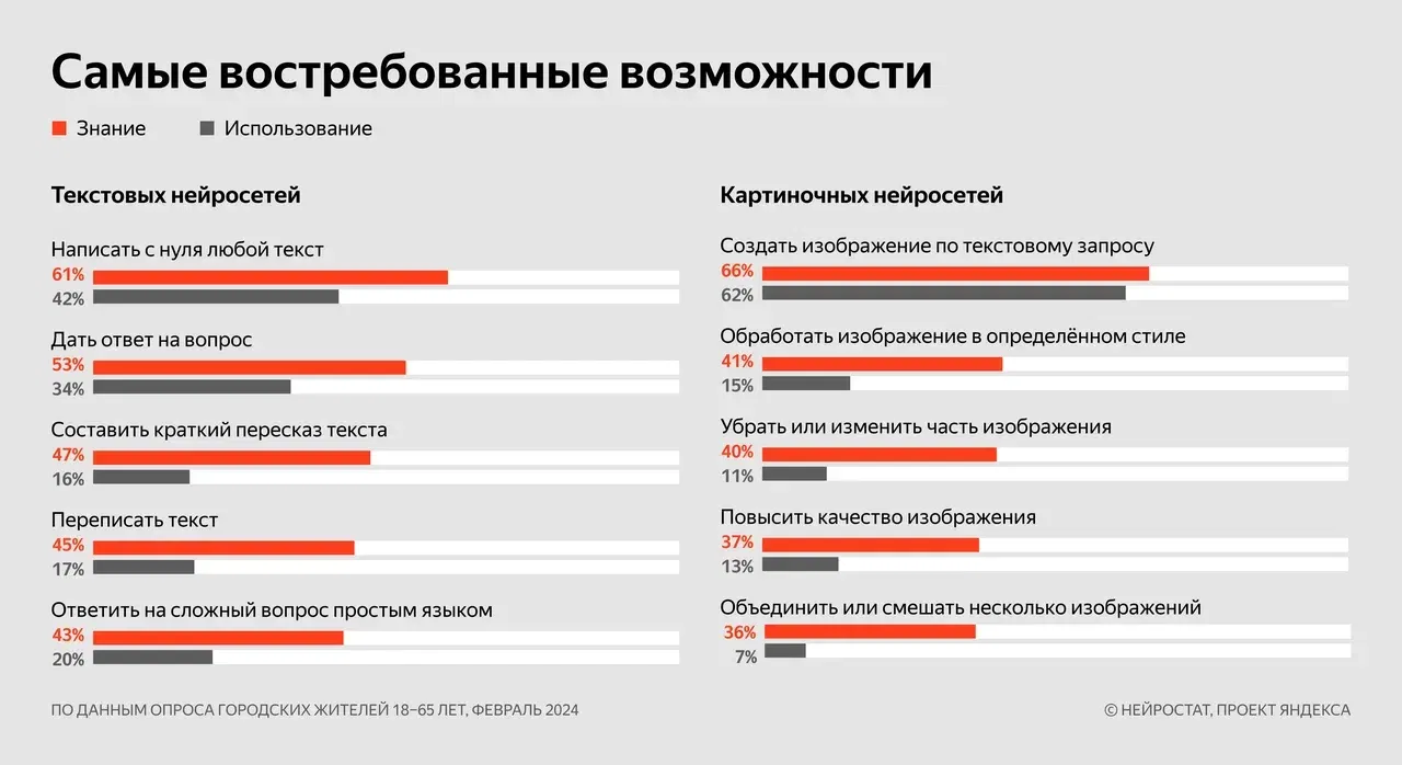 Среди молодых людей популярны такие задачи, как написание кода, создание постов в социальных сетях и разработка контент-планов. В то же время, люди старше 45 лет чаще используют нейросети для создания музыки, обработки и улучшения качества фотографий и написания стихов.