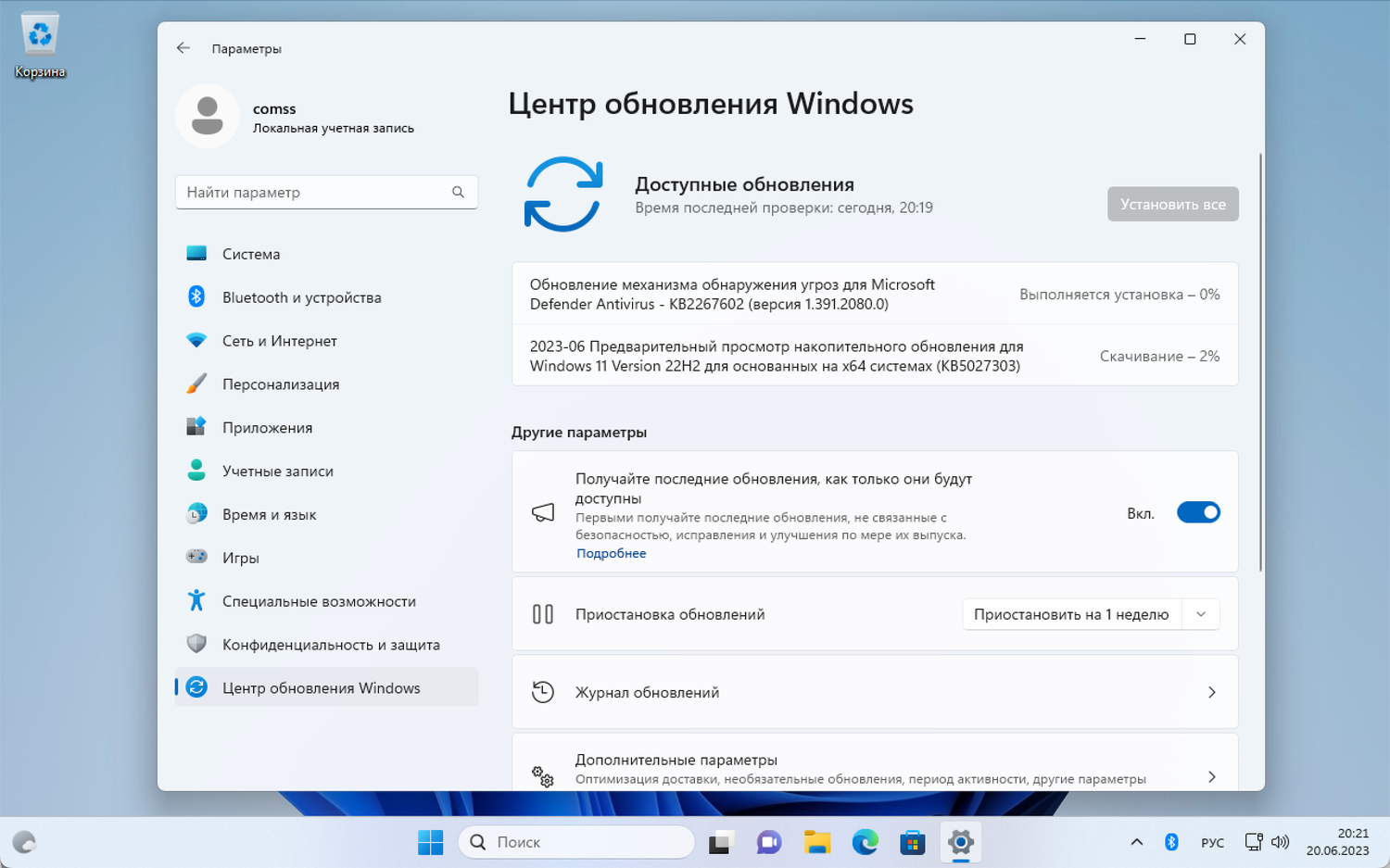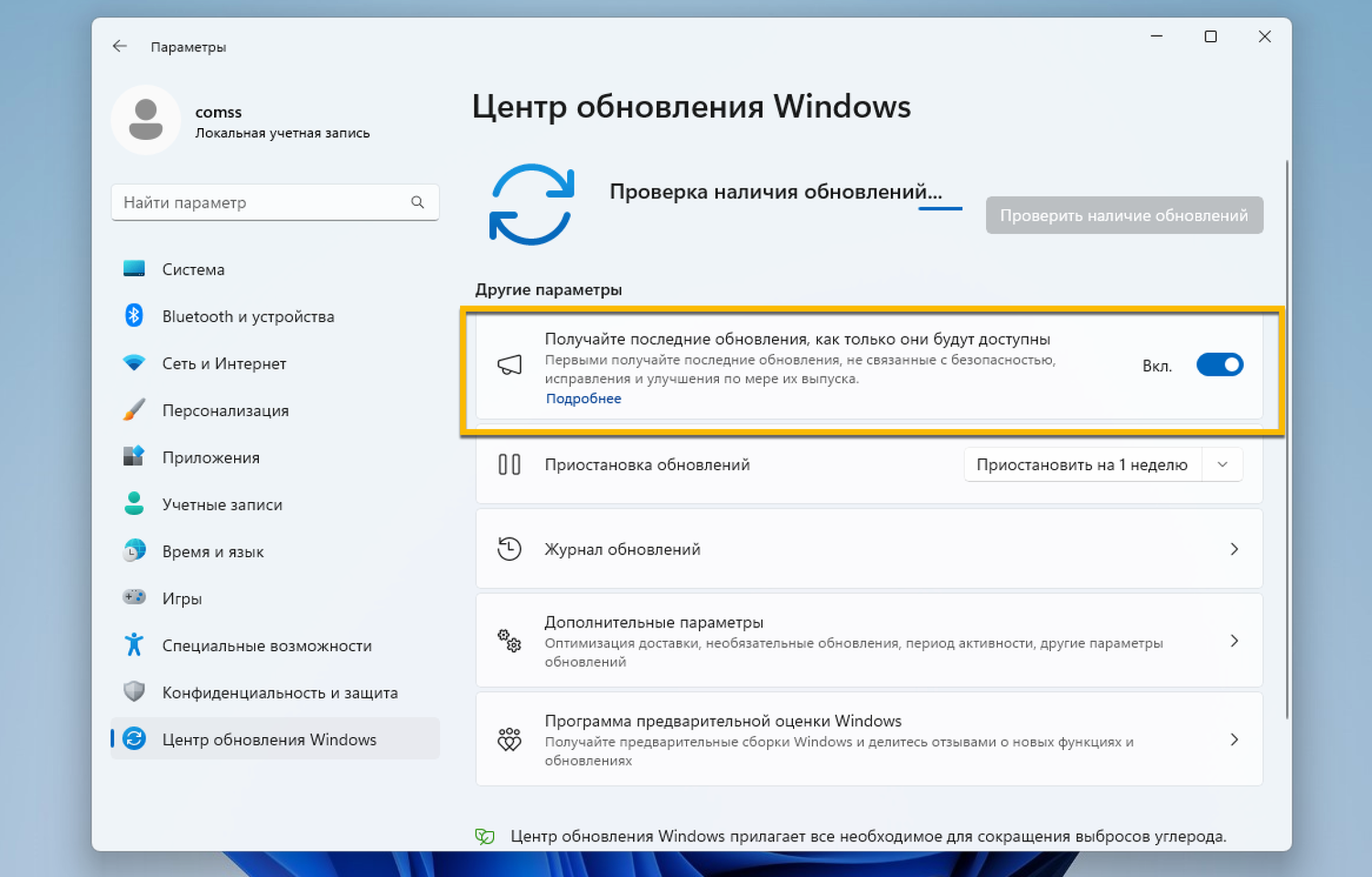 Чтобы предварительные обновления устанавливались автоматически, включите опцию Получайте последние обновления, как только они будут доступны меню Параметры > Центр обновления Windows.
