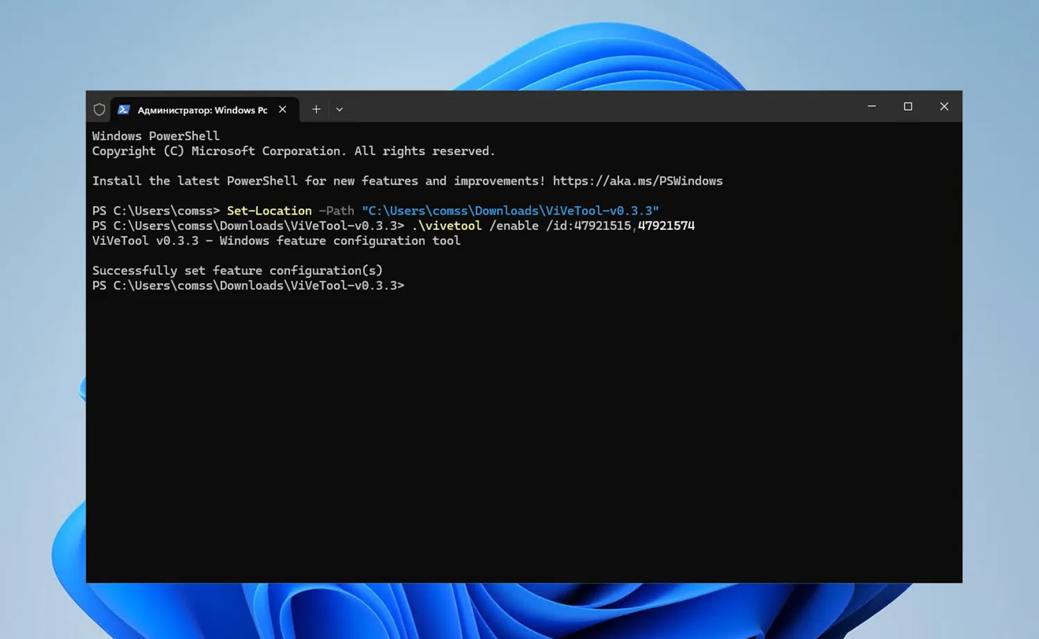 Примечание: В примерах используются команды в Терминале для профиля PowerShell . Если вы используете профиль Командная строка, замените начальную команду .\vivetool на vivetool.