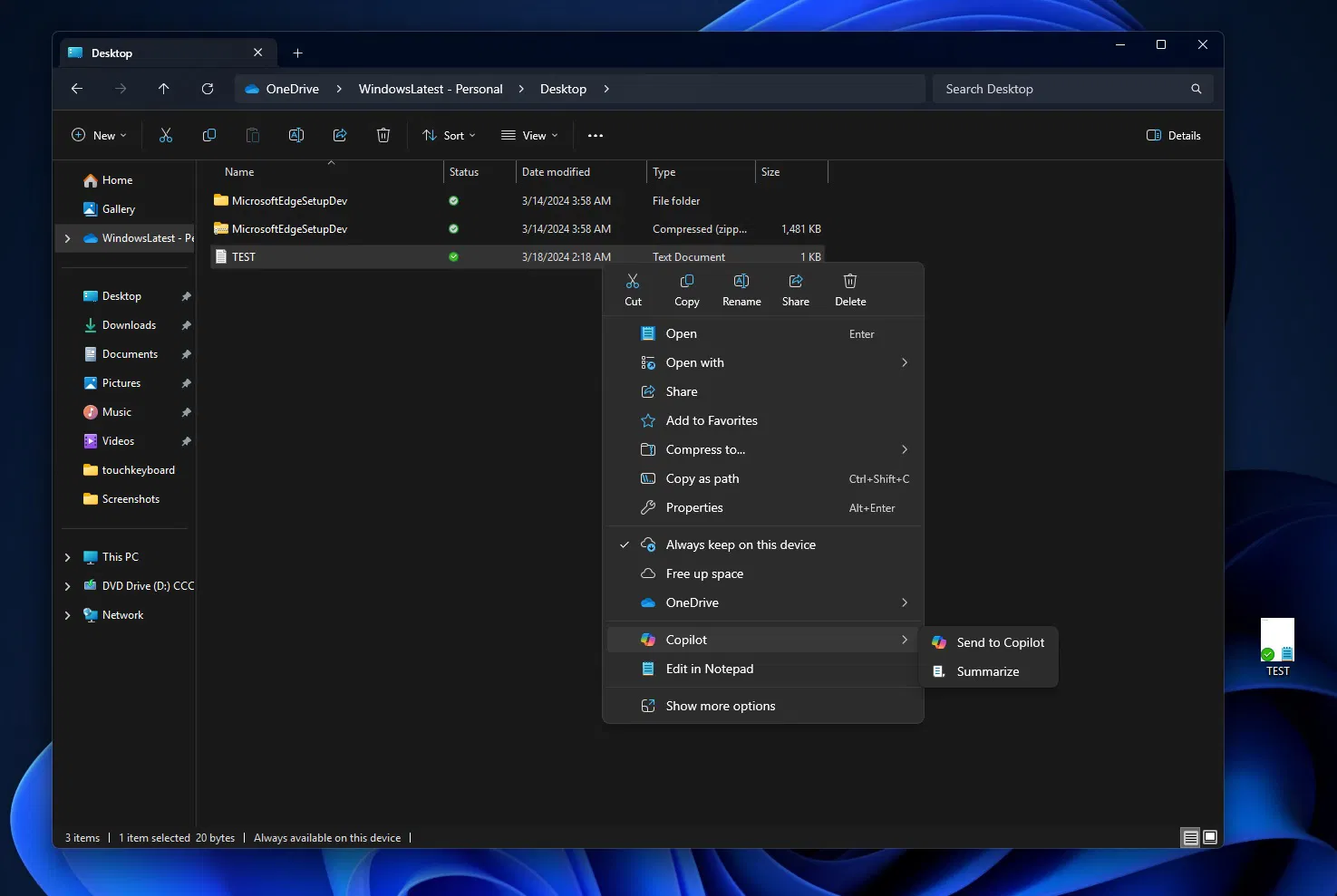 Для Проводника тестируется функция «Copilot» в контекстном меню, которая позволяет отправлять файлы искусственному интеллекту для создания сводки.