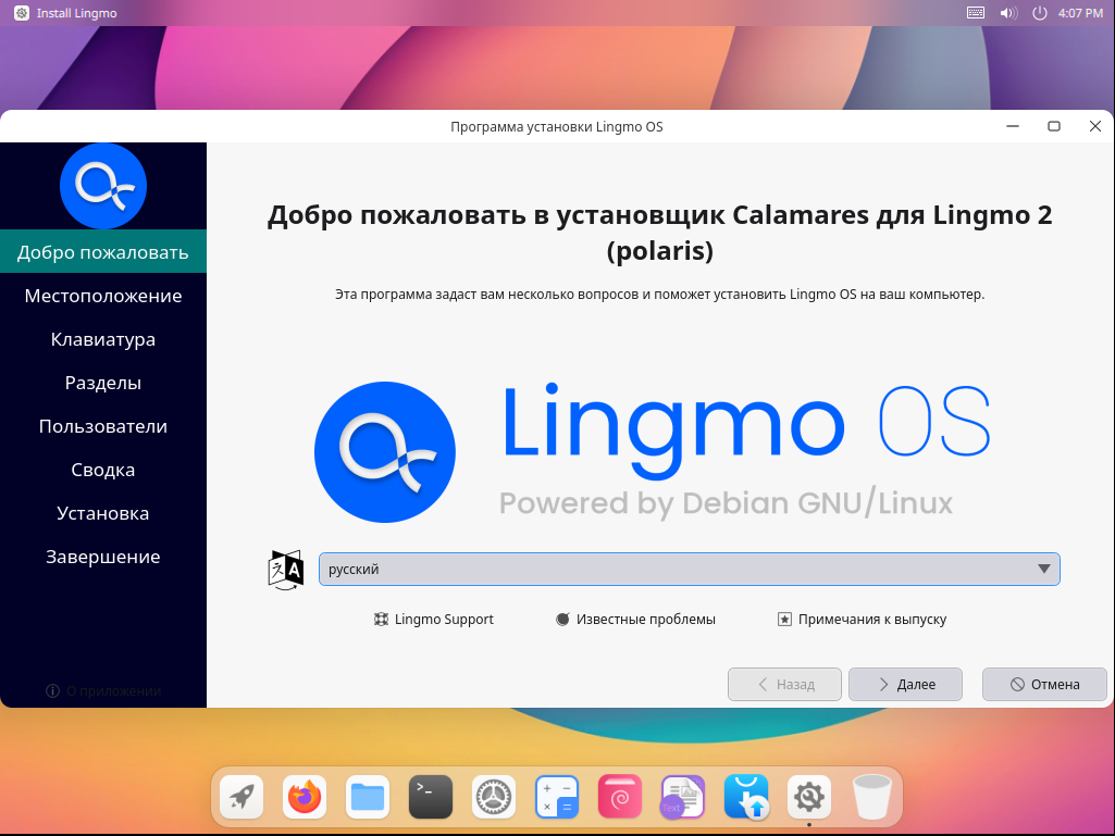 В качестве установщика системы используется инструмент Calamares.
