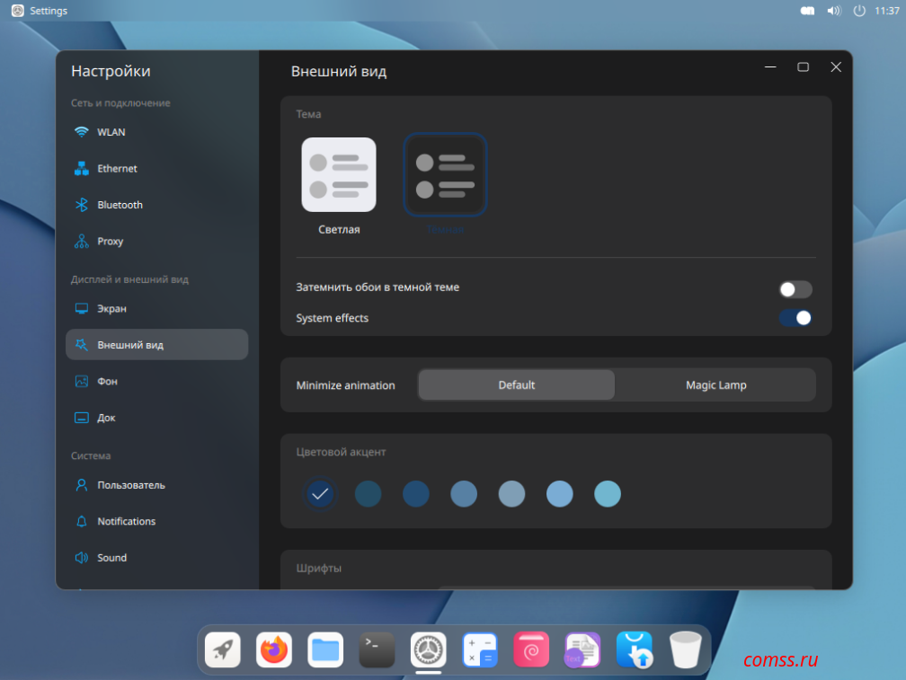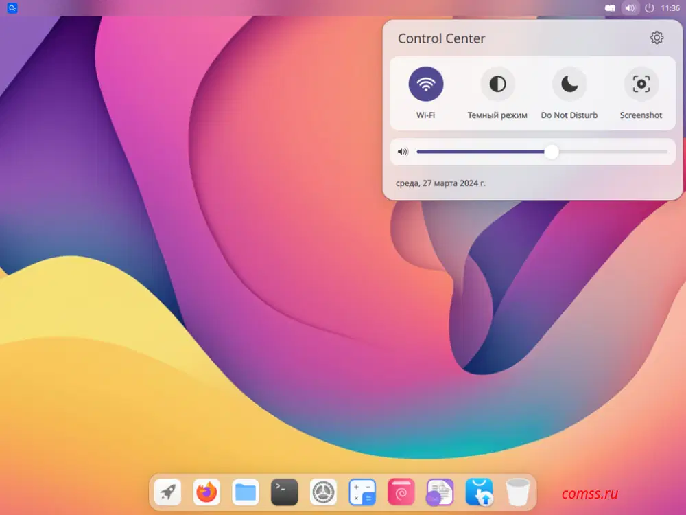 В комплект поставки Lingmo OS входит ограниченный набор приложений, что подчёркивает стремление разработчиков создать лёгкую операционную систему. В док-панели представлен удобный доступ к установленным приложениям, а в заголовочной панели рабочего стола расположен аккуратный центр управления. Он предлагает такие опции, как включение/выключение Wi-Fi, переключение темной темы, режим "Не беспокоить", регулировка громкости и доступ к настройкам.