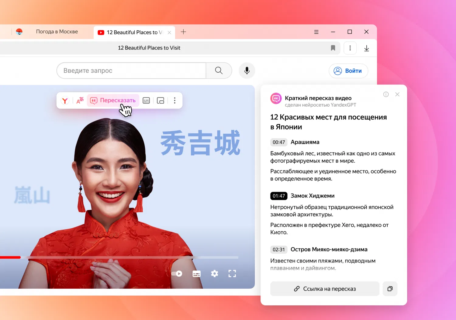 Яндекс.Браузер — это быстрый и безопасный интернет-браузер, в котором используются генеративные нейросети нового поколения для создания текстов и изображений, пересказа видео и статей, а также распознавания QR-кодов в видео. Браузер обладает функцией закадрового перевода видео на восемь языков, предупреждает о подозрительных сайтах, проверяет скачанные файлы на наличие вирусов и обеспечивает защиту от кражи паролей и банковских данных.