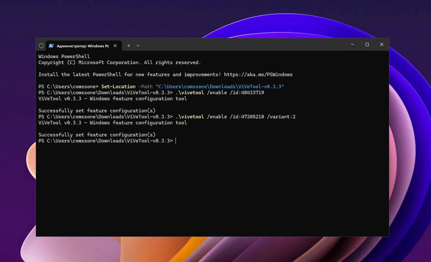 Примечание: В примерах используются команды в Терминале для профиля PowerShell . Если вы используете профиль Командная строка, замените начальную команду .\vivetool на vivetool.