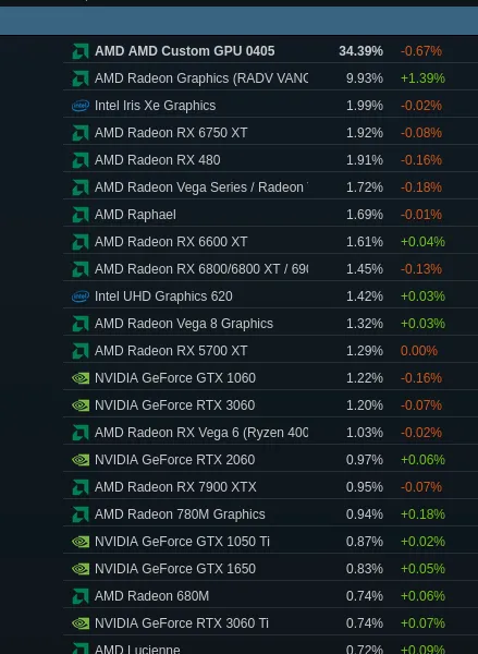 В сфере видеокарт среди пользователей Linux на Steam также лидируют решения AMD, благодаря интегрированной графике Radeon в Steam Deck и популярности графических карт AMD Radeon в целом за счет хорошей поддержки открытых драйверов.