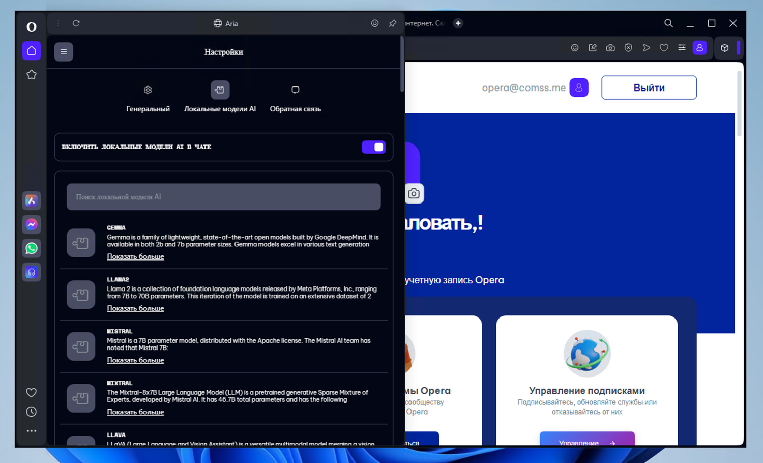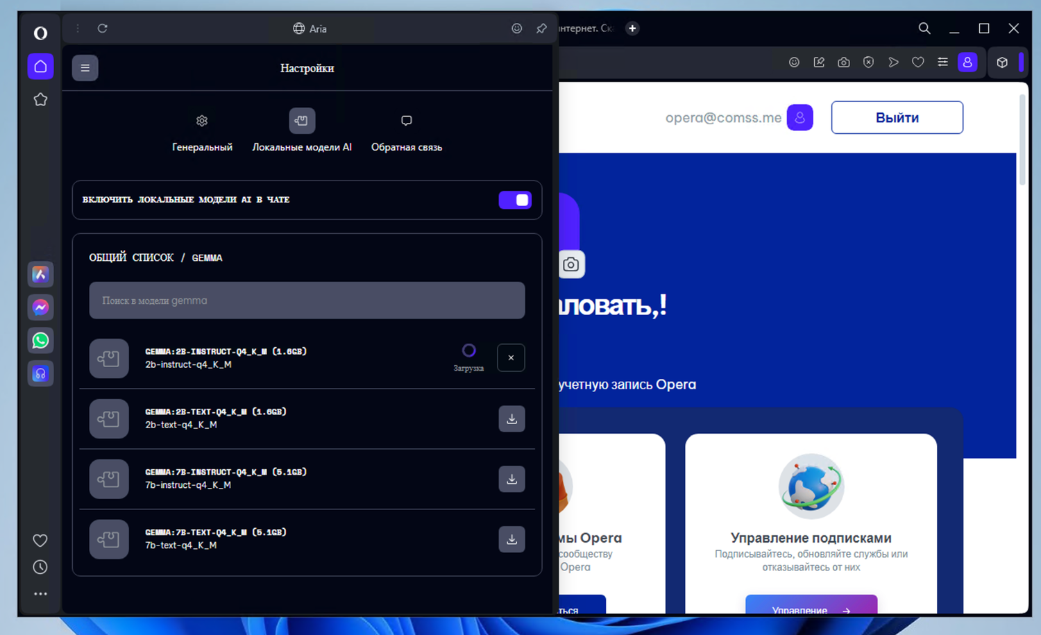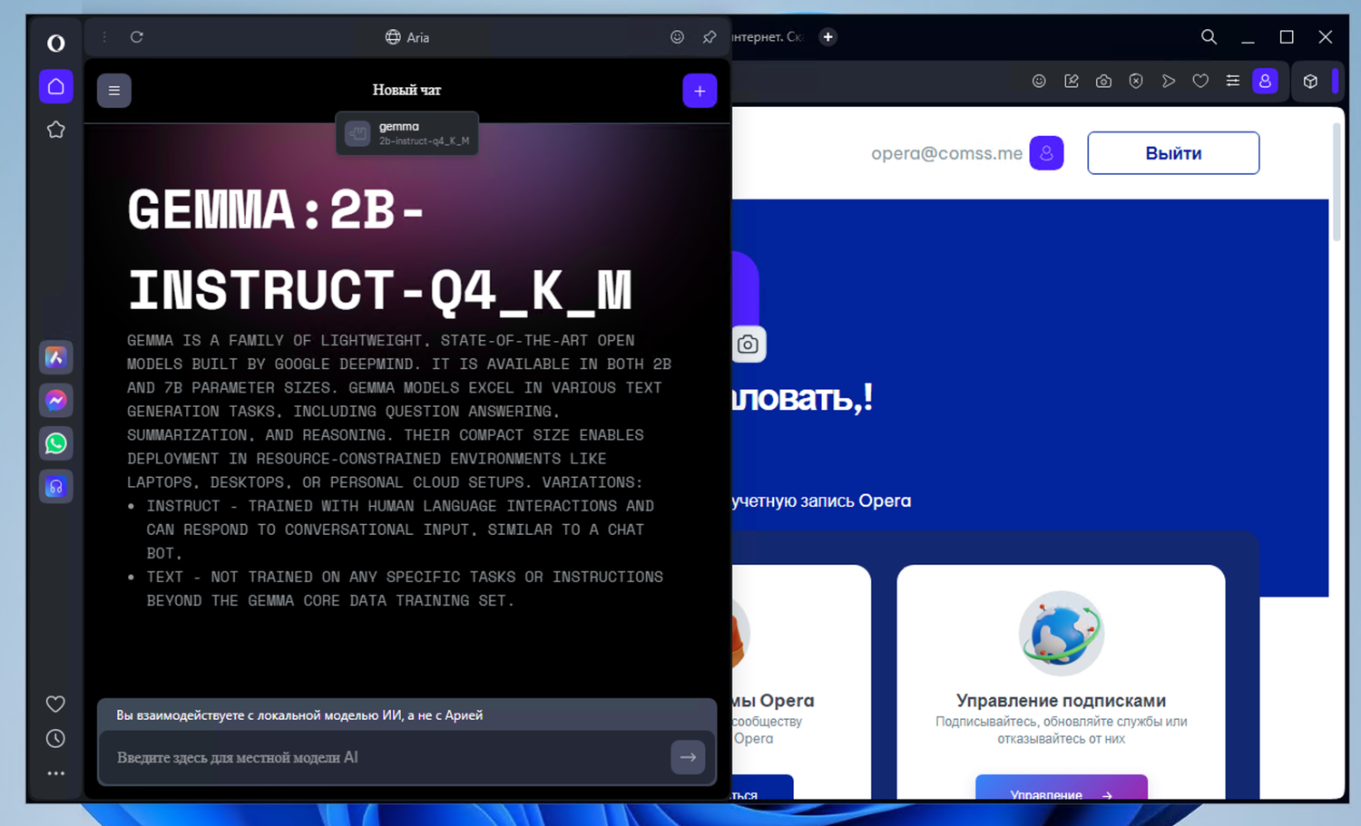 Выбор локальной LLM затем загрузит ее на ваше устройство. Учтите, что для каждой модели требуется от 2 до 10 ГБ свободного места на локальном диске и что локальная LLM, скорее всего, будет значительно медленнее в выдаче результатов, чем серверная, поскольку все зависит от вычислительных способностей вашего оборудования. Локальная LLM будет использоваться вместо Aria, нативного браузерного ИИ Opera, пока вы не начнете новый чат с Aria или просто не включите Aria обратно.