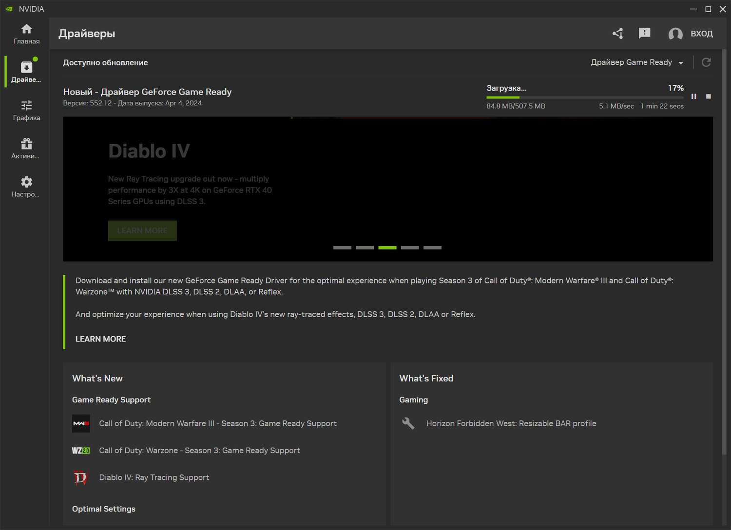 В обновлении графического драйвера NVIDIA GeForce Game Ready 552.12 WHQL представлены оптимизации для Call of Duty: Modern Warfare III и Call of Duty: Warzone Season 3, а также для обновления Diablo IV с поддержкой трассировки лучей. Новый драйвер также ускоряет эти игры благодаря NVIDIA DLSS 3 и делает игровой процесс более отзывчивым с помощью NVIDIA Reflex.