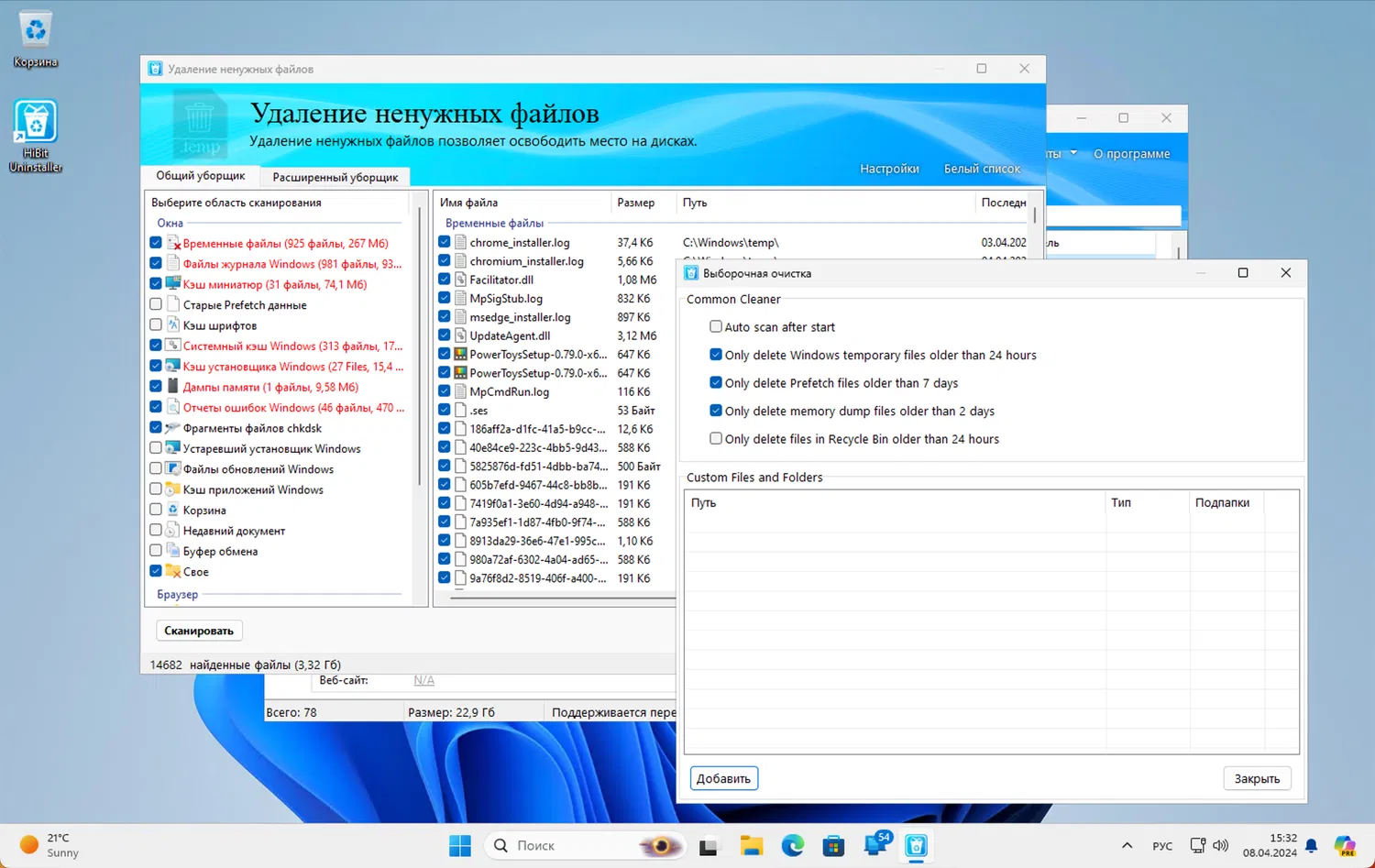- Добавлено окно настроек "Выборочная очистка" в инструменте "Удаление ненужных файлов", в разделе "Общий уборщик": Это нововведение дает пользователям больше контроля и гибкости при настройке процесса очистки, позволяя выбирать, какие файлы и категории должны быть очищены.