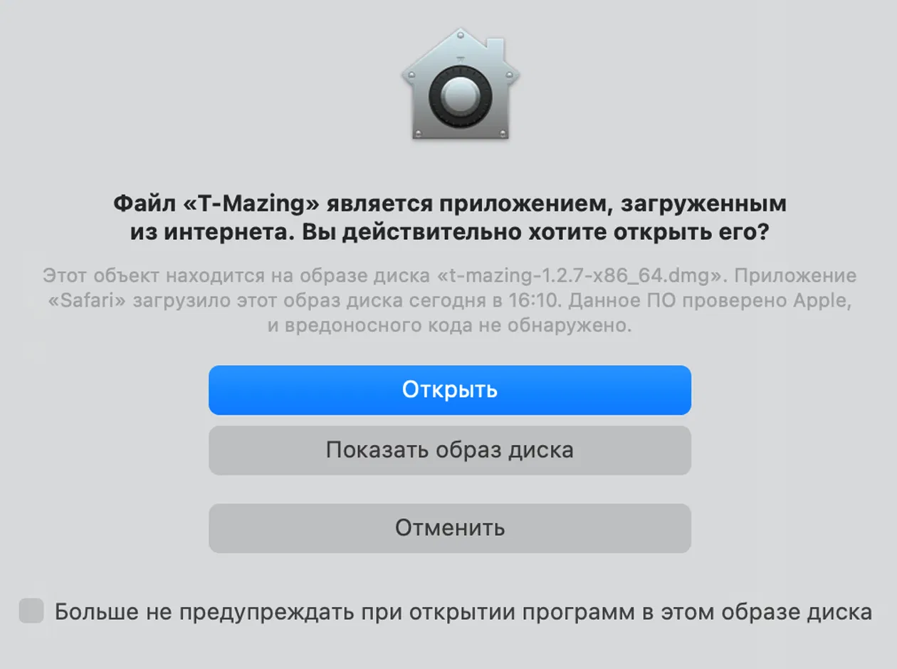 - Откройте скачанный установщик. Если появится предупреждение о загрузке с неизвестного источника, выберите «Открыть».
