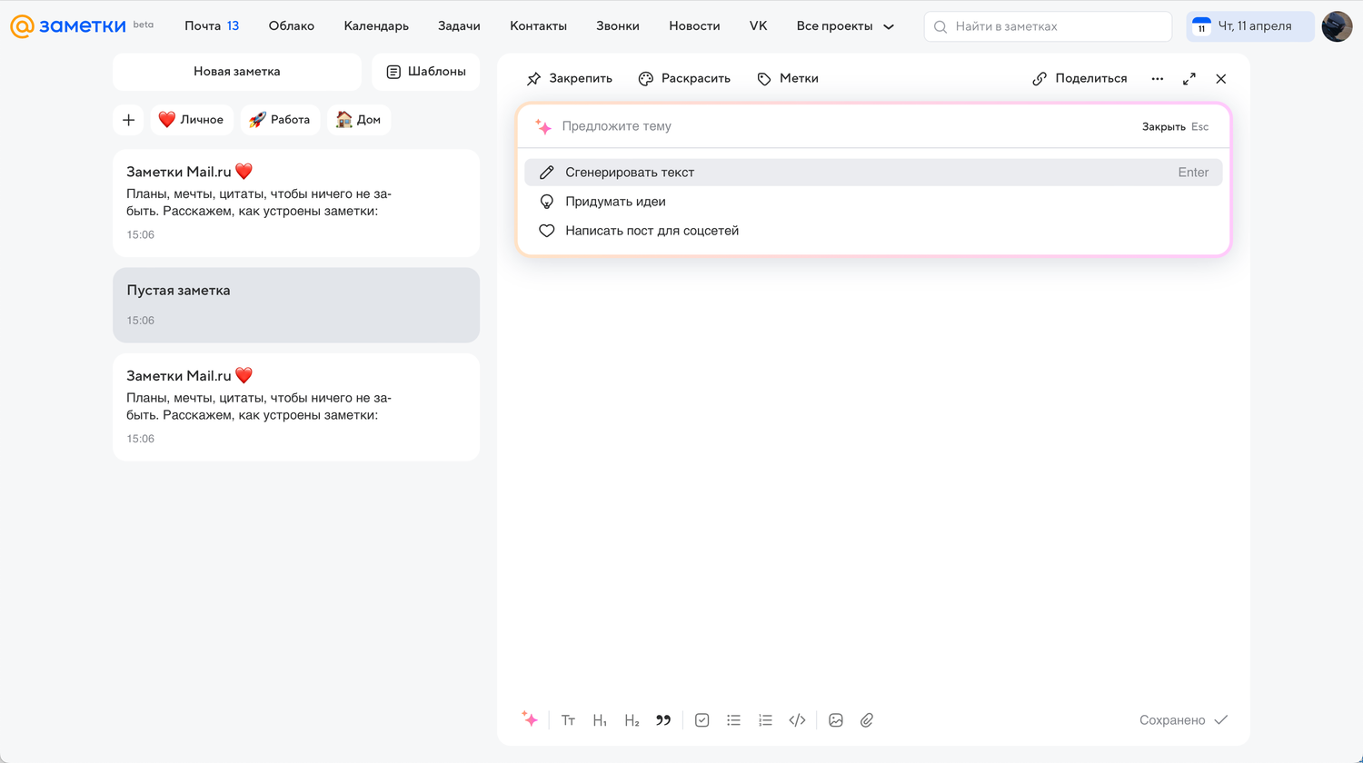 Дмитрий Меркушов, руководитель группы машинного обучения Mail.ru, отметил, что открытое бета-тестирование позволит компании оценить перспективы развития генеративных нейросетей и улучшить их функциональность. Чтобы начать использовать ИИ, пользователи могут обратиться к специальным функциям в приложениях Почта, Облако, Заметки и Календарь.