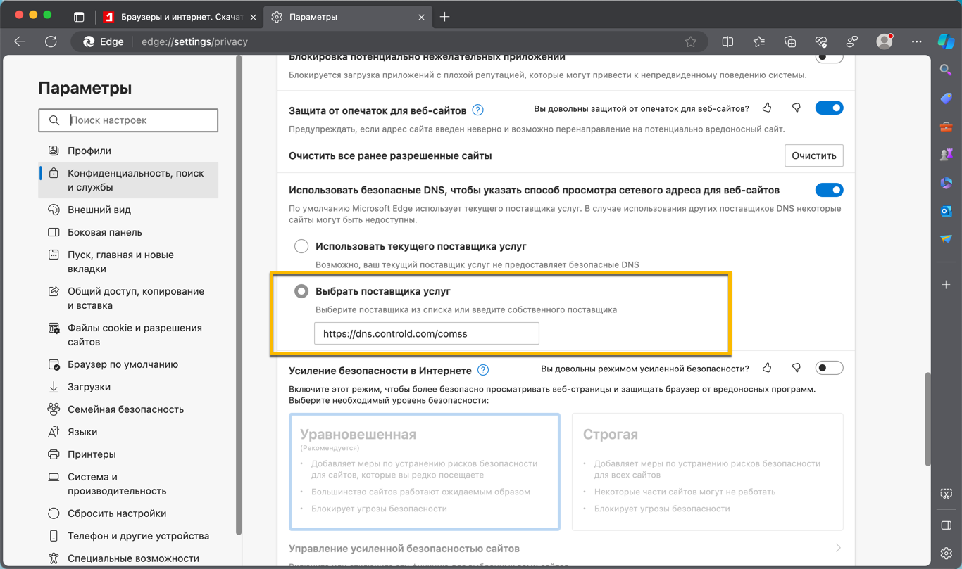 Выбрать поставщика услуг адрес DoH-сервера https://dns.controld.com/comss.