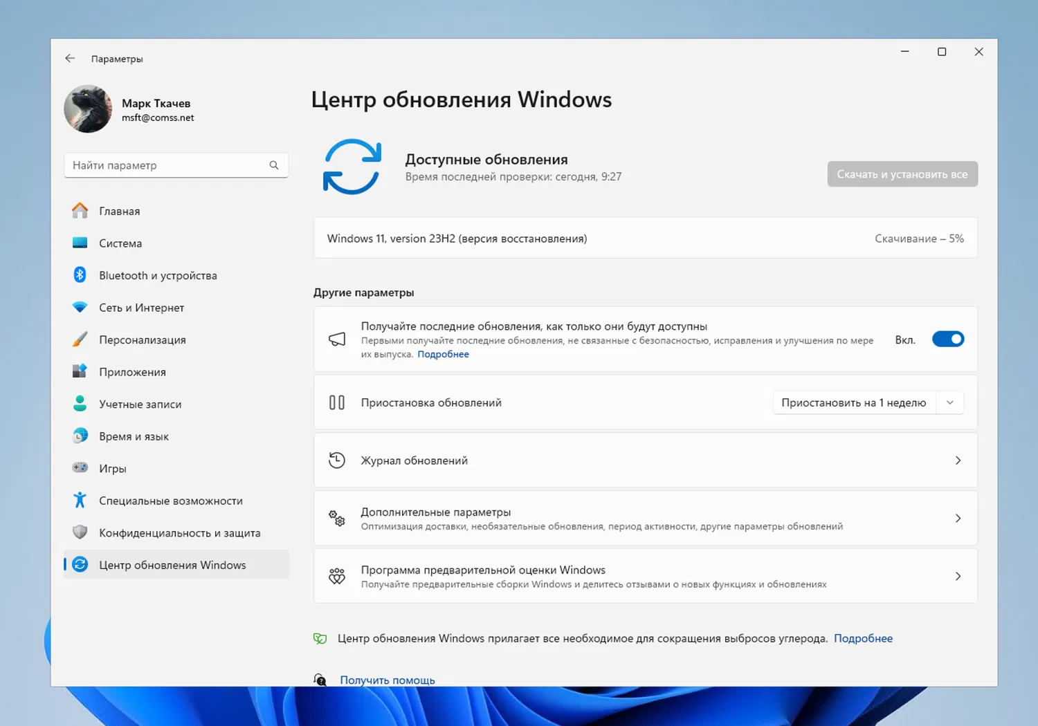 Переустановка Windows 11 с помощью Центра обновления Windows