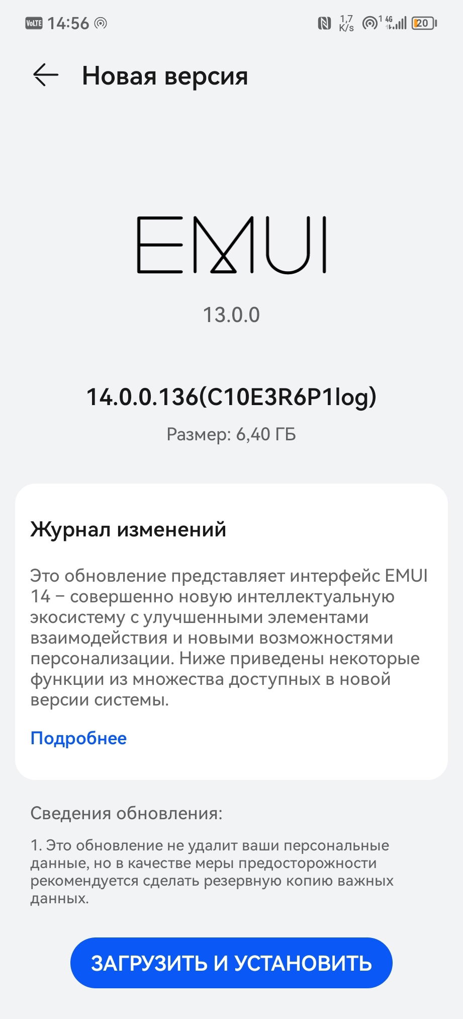 Размер обновления: Для установки новой прошивки версии 14.0.0.136 потребуется 6.40 ГБ свободного места на устройстве. Рекомендуется использовать стандартное подключение Wi-Fi для загрузки обновления.