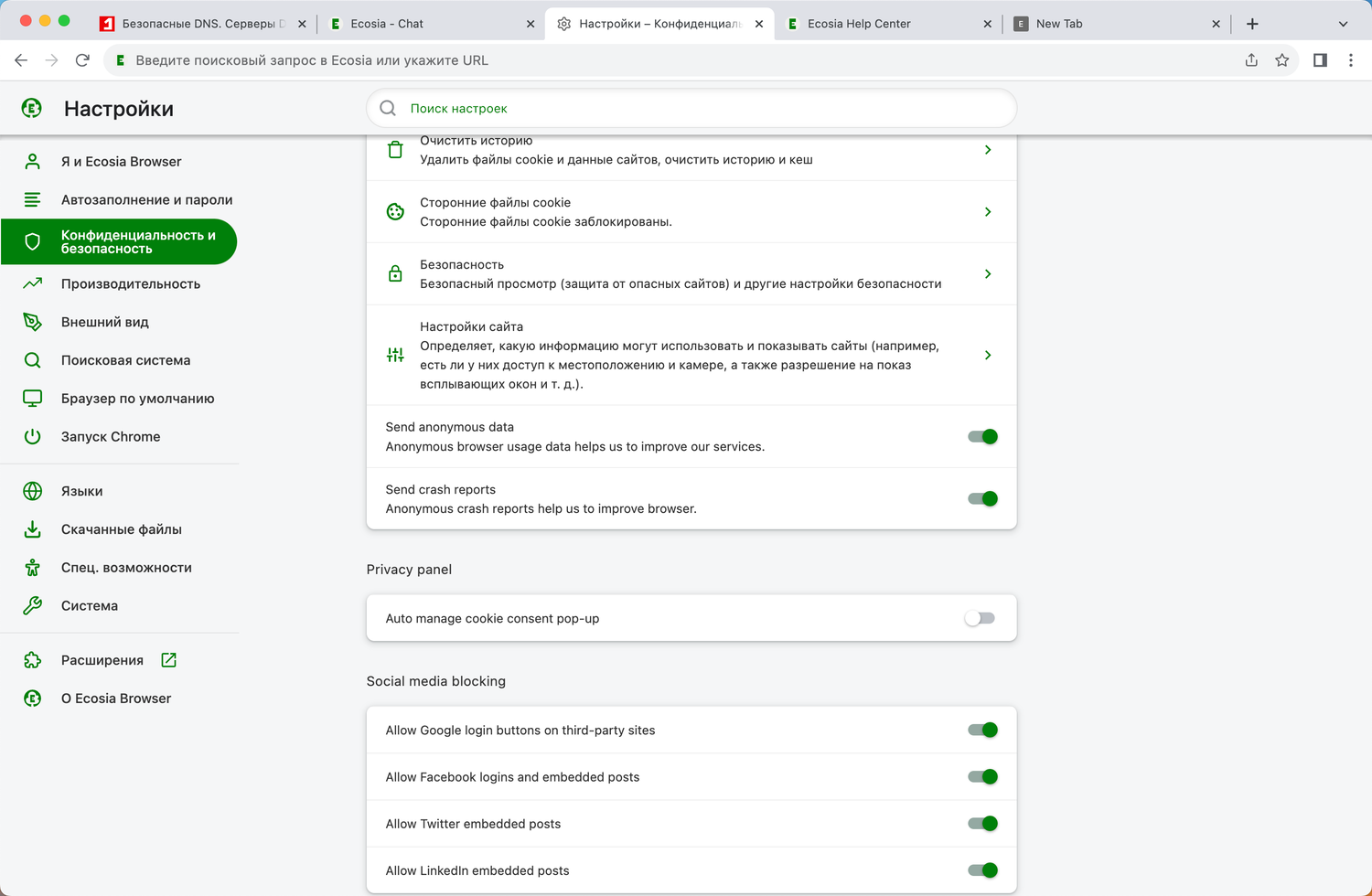 Браузер Ecosia настроен на отправку анонимных данных, таких как использование браузера и отчеты о сбоях, для помощи в улучшении приложения. Вы можете отключить эти опции в разделе Настройки > Конфиденциальность и безопасность.