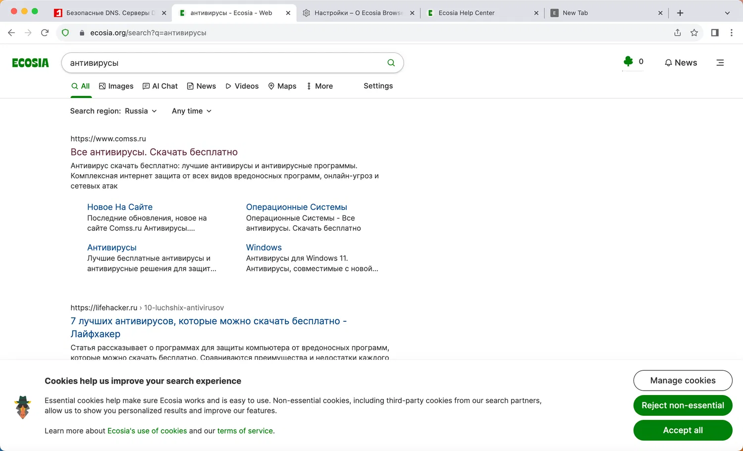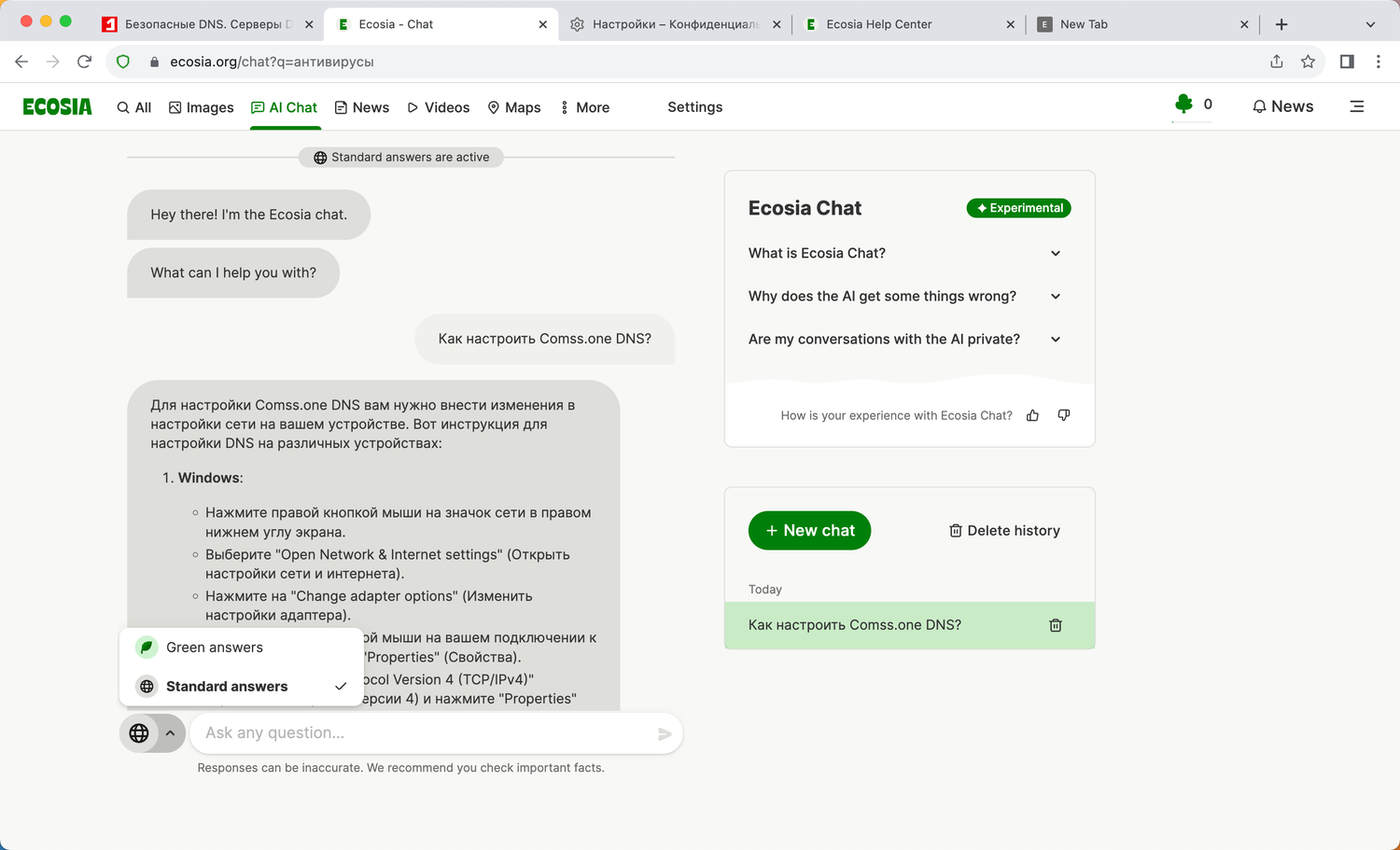 Для работы ИИ-чата Ecosia в России, вы можете использовать Comss.one DNS. Перейдите в настройки браузера Настройки > Конфиденциальность и безопасность > Безопасность > Выбрать поставщика услуг DNS, для Добавить своего поставщика услуг DNS укажите в поле