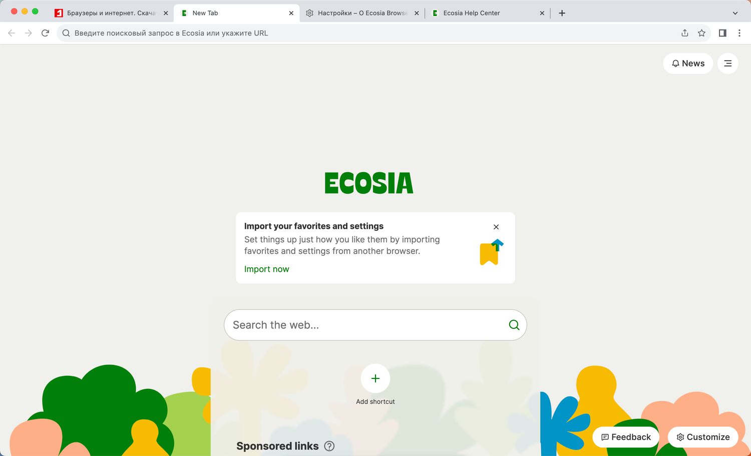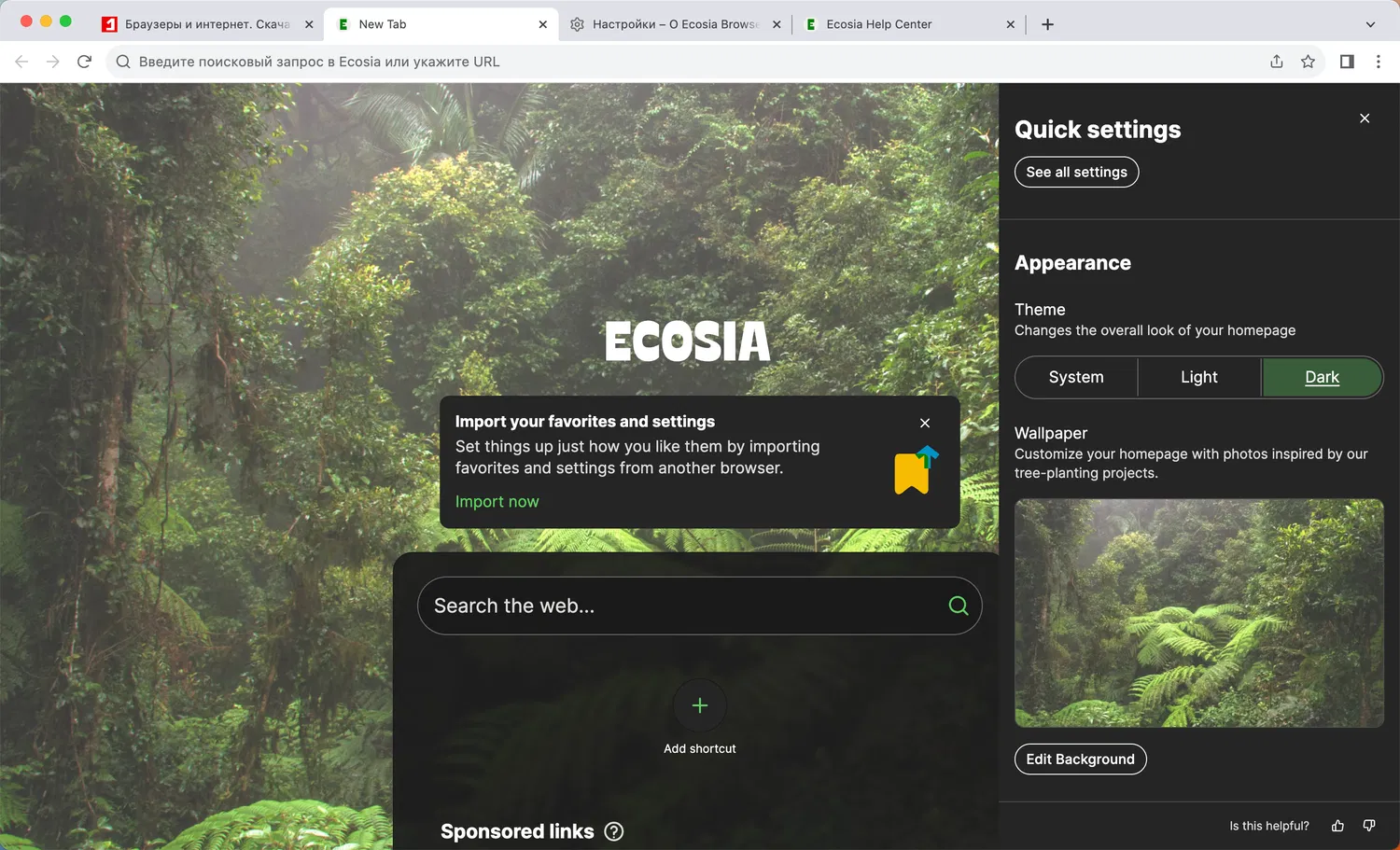 При открытии браузера вас встречая яркая страница новой вкладки, и вы можете настроить фоновое изображений. Ecosia предлагает свой набор качественных обоев, которые позаимствованы из проектов по посадке деревьев.
