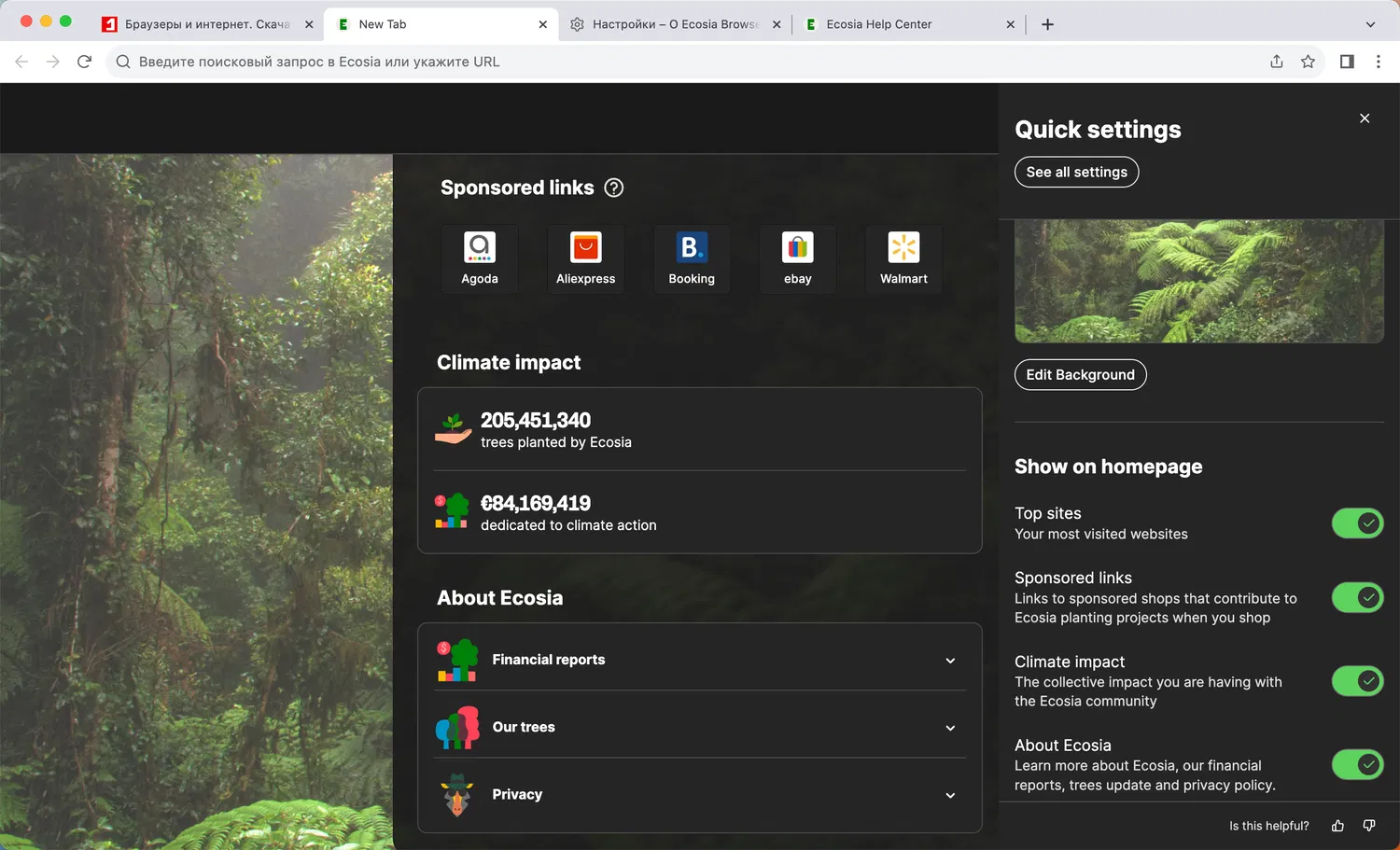 На странице новой вкладки браузера Ecosia отображаются некоторые статистические данные о его влиянии на климат, такие как количество посаженных деревьев, сумма пожертвований, и есть ярлыки с финансовыми отчетами компании, ее проектами по посадке деревьев. Если вы любите более минималистичные страницы новой вкладки, то панель быстрых настроек позволяет отключить популярные сайты, спонсируемые ссылки, данные о влиянии на климат и раздел о Ecosia.