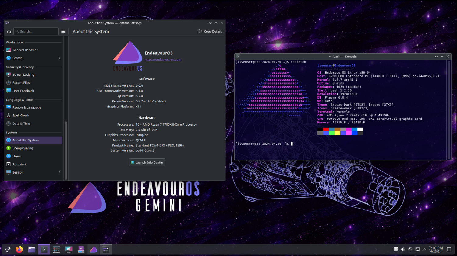 Ключевой особенностью релиза Gemini является полноценная интеграция среды рабочего стола KDE Plasma 6.0.4, поддерживаемой Qt6. Эта версия Plasma предлагает усовершенствованные настройки и более современный пользовательский интерфейс, доступный как в окружении live на X11, так и в установленной системе с возможностью выбора Wayland для передового опыта или X11.