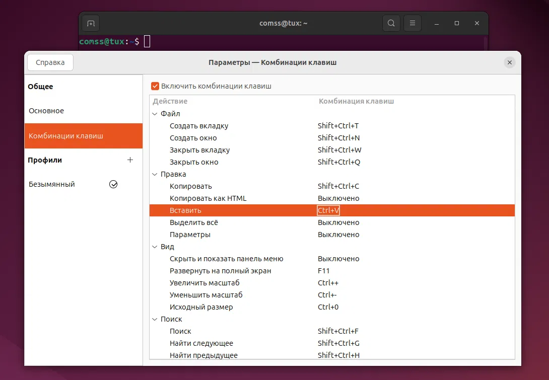 Переходим в меню Терминала Параметры > Комбинация клавиш > Вставить (для удобства задаём клавиши CTR+V).