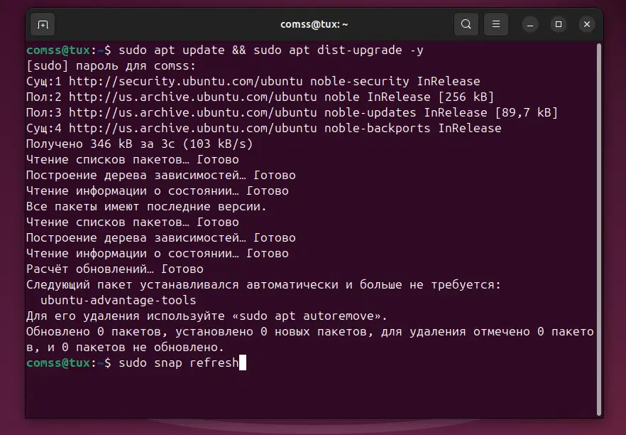 А так же обновим snap пакеты (достаточно запустить один раз после установки системы, затем они будут автоматически обновляться):