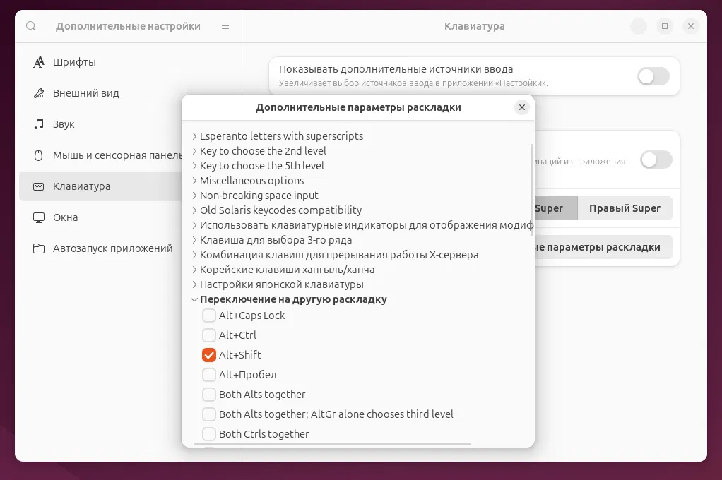 Открываем приложение Дополнительные настройки Gnome > Клавиатуры и мышь > Дополнительные параметры раскладки > Переключение на другую раскладку.