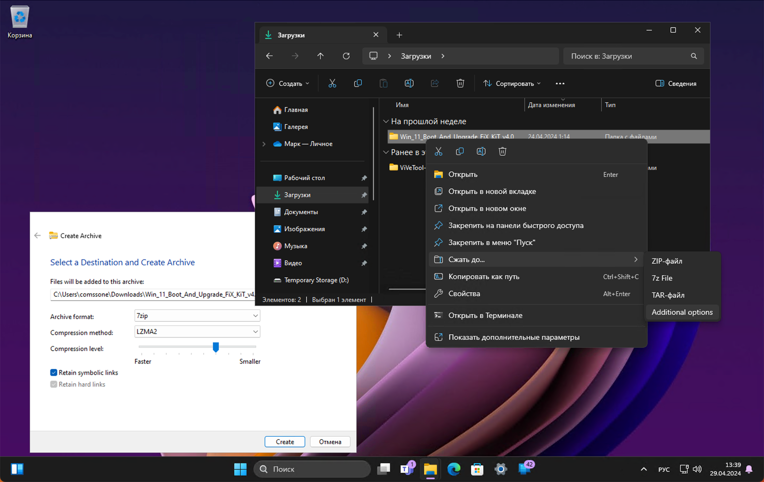 Как включить создание архивов в форматах 7z и TAR в Windows 11