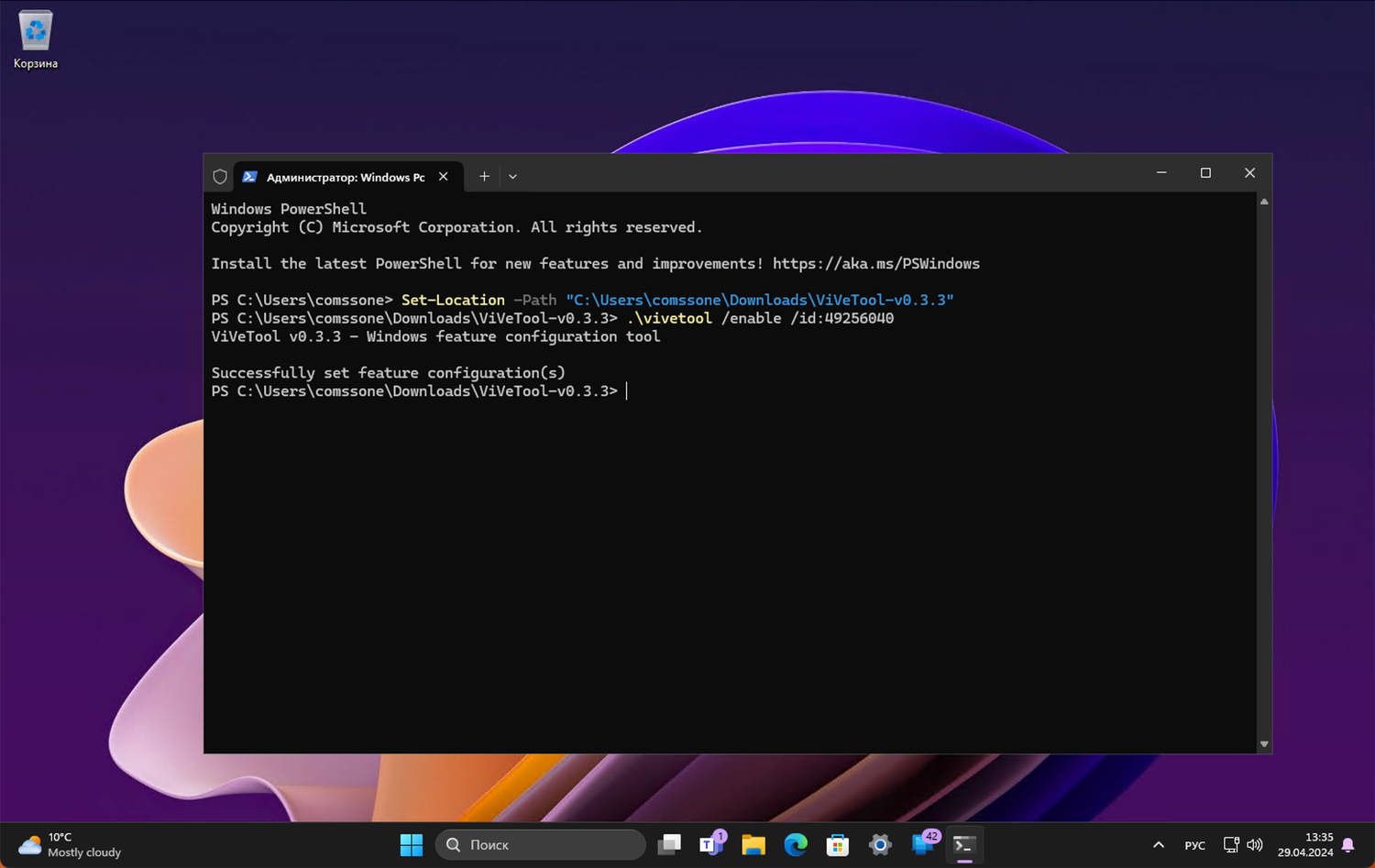 Примечание: В примерах используются команды в Терминале для профиля PowerShell . Если вы используете профиль Командная строка, замените начальную команду .\vivetool на vivetool.