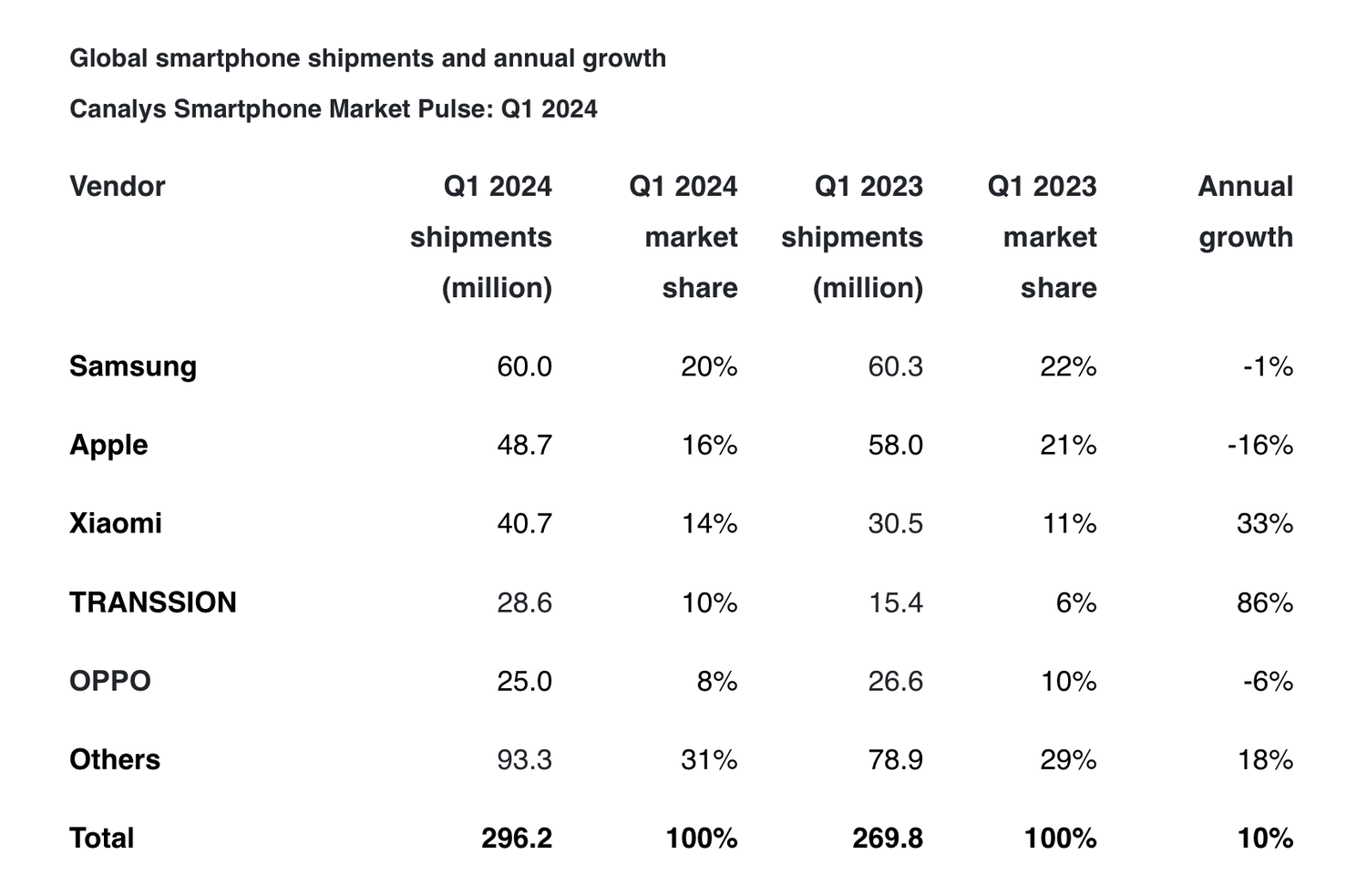 Согласно последнему отчету аналитической компании Canalys, глобальные поставки смартфонов в первом квартале 2024 года достигли 296,2 миллиона единиц, что на 10% больше по сравнению с прошлым годом и стало первым двузначным ростом за последние десять кварталов.