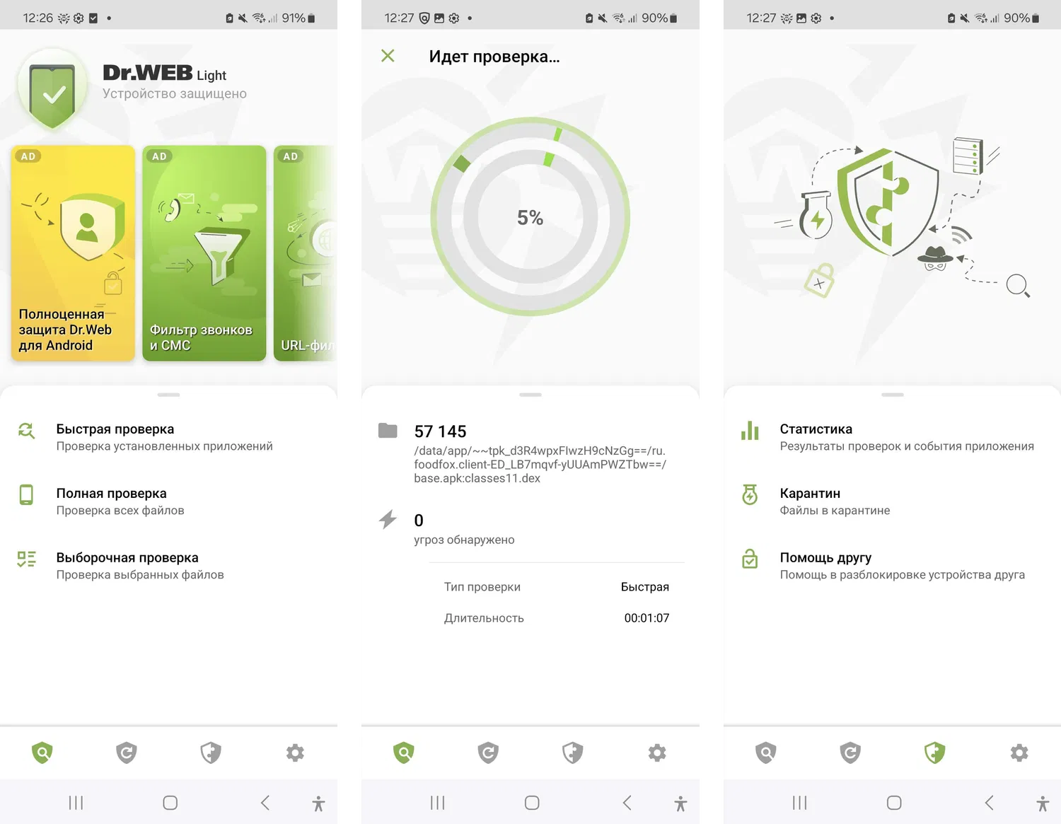 Основные функции Dr.Web Light для Android включают: