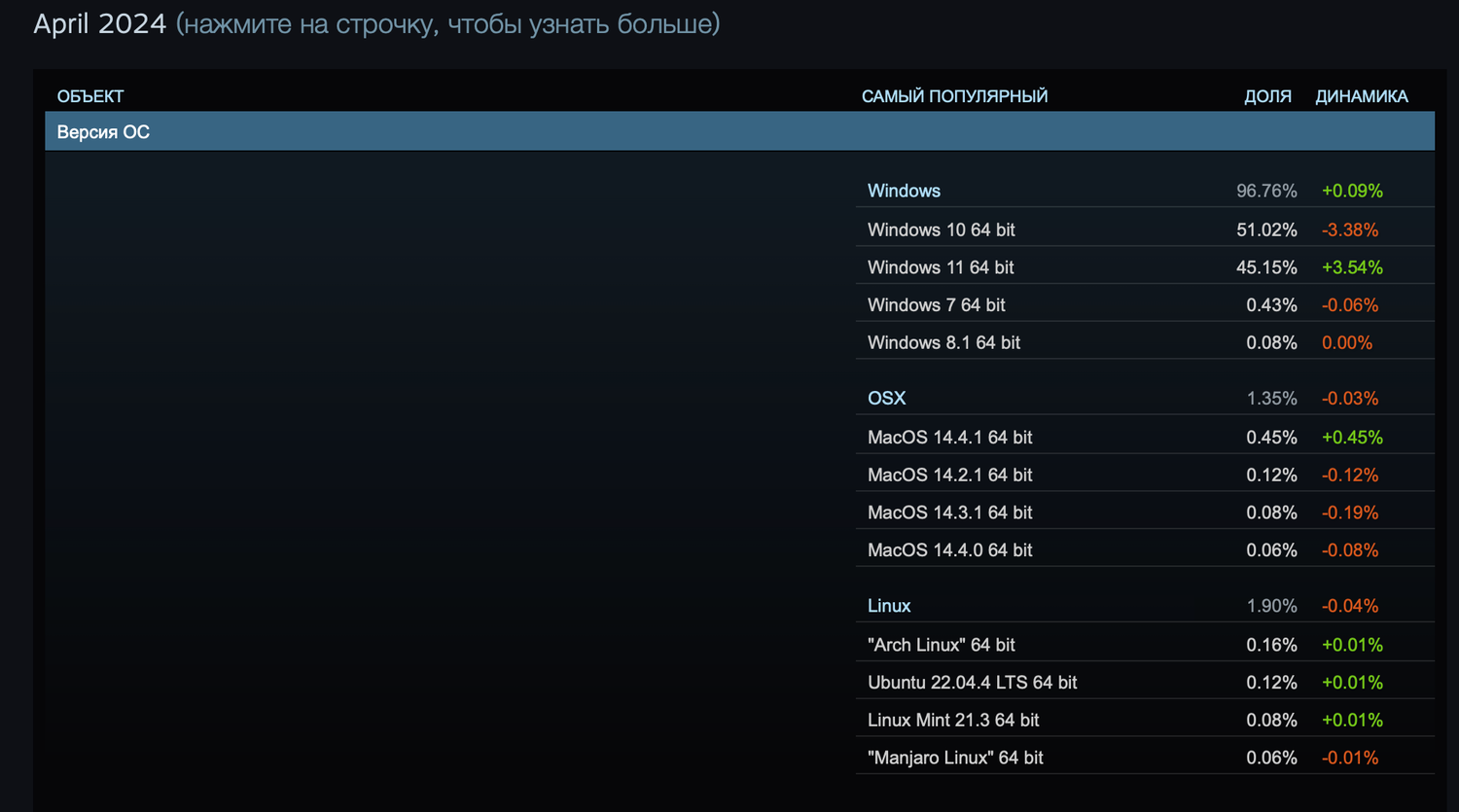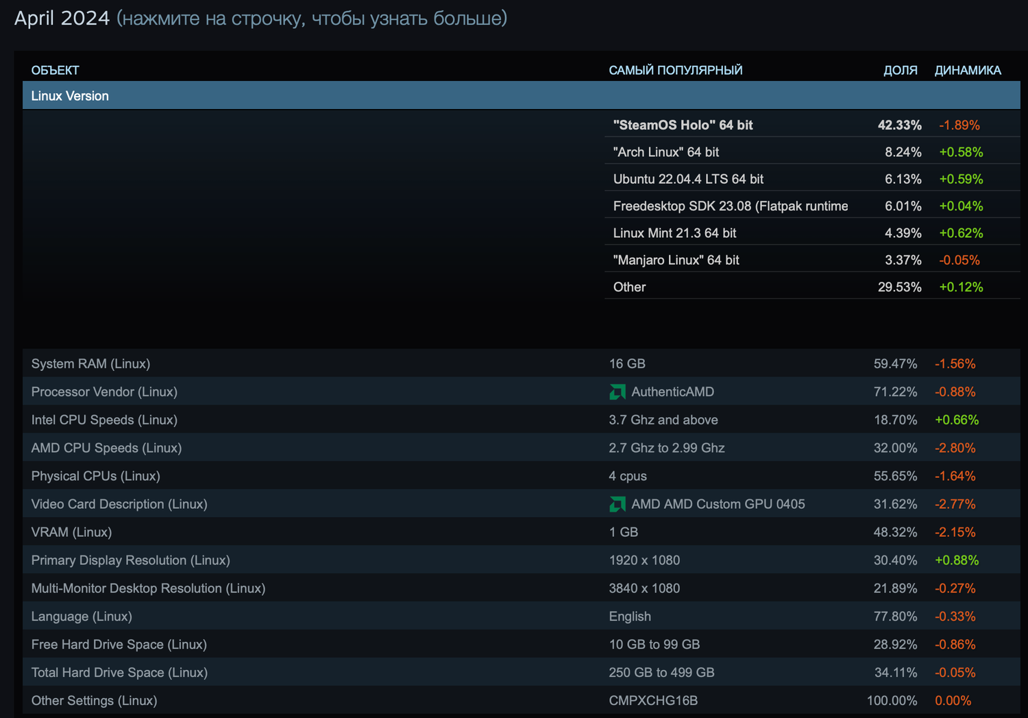 Также данные по видеокартам показывают снижение использования GPU AMD Custom 0405 (Steam Deck) на 2,77%. Тем не менее, Steam Deck с операционной системой SteamOS остаётся наиболее популярной платформой среди пользователей Linux на Steam.