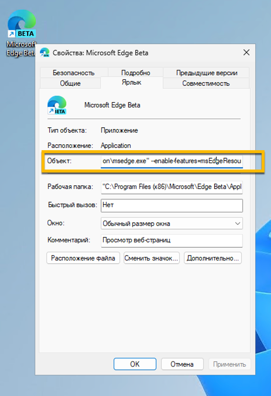 - Убедитесь, что между "...msedge.exe" и --enable-features есть пробел. Нажмите ОК и запустите браузер, дважды кликнув по измененному ярлыку, и вы получите доступ к ограничителю оперативной памяти.