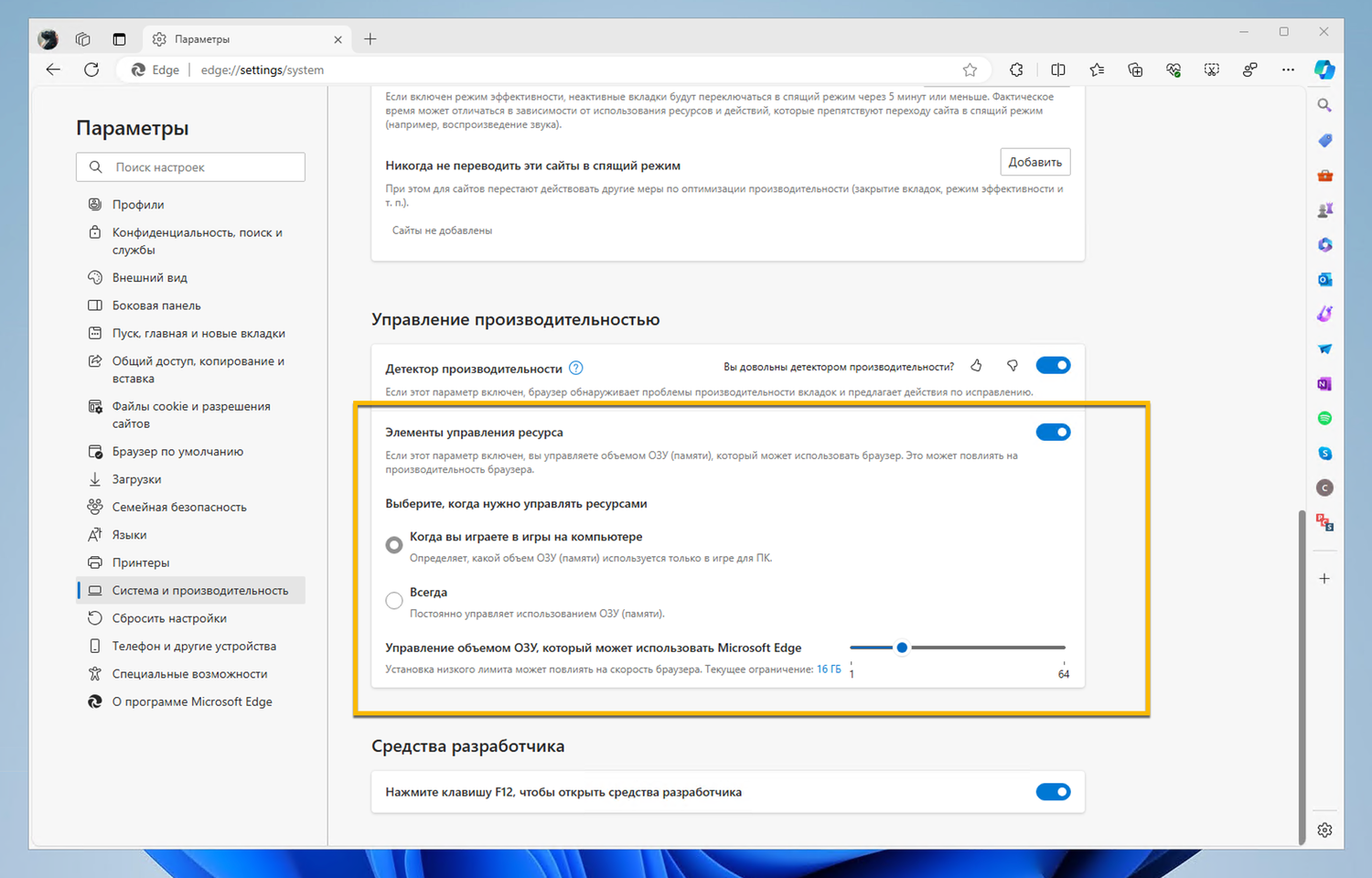 При включении этой настройки по умолчанию использование оперативной памяти контролируется только во время игр на ПК (опция Когда вы играете в игры на компьютере). Если вы хотите ограничить использование оперативной памяти Edge в любое время, выберите опцию Всегда.