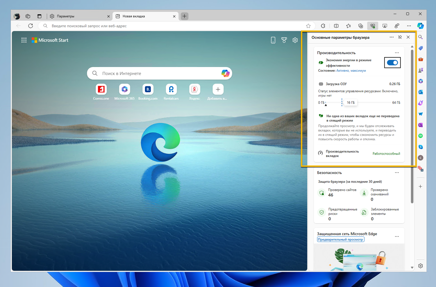 Для контроля за производительностью браузера используйте боковую панель Основные параметры браузера в Microsoft Edge. Теперь она также позволяет отслеживать установленный лимит ОЗУ.