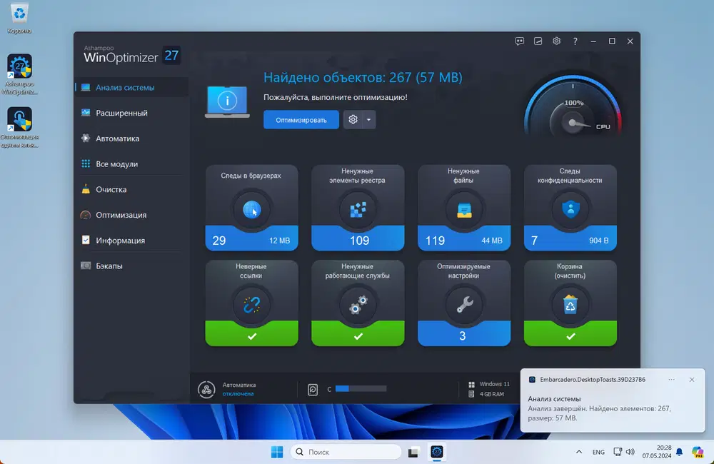 Пробная версия программы доступна на 30 дней бесплатно. Ashampoo WinOptimizer 27 официально поддерживает оптимизацию и настройку ОС Windows 11, Windows 10 и Windows 7.