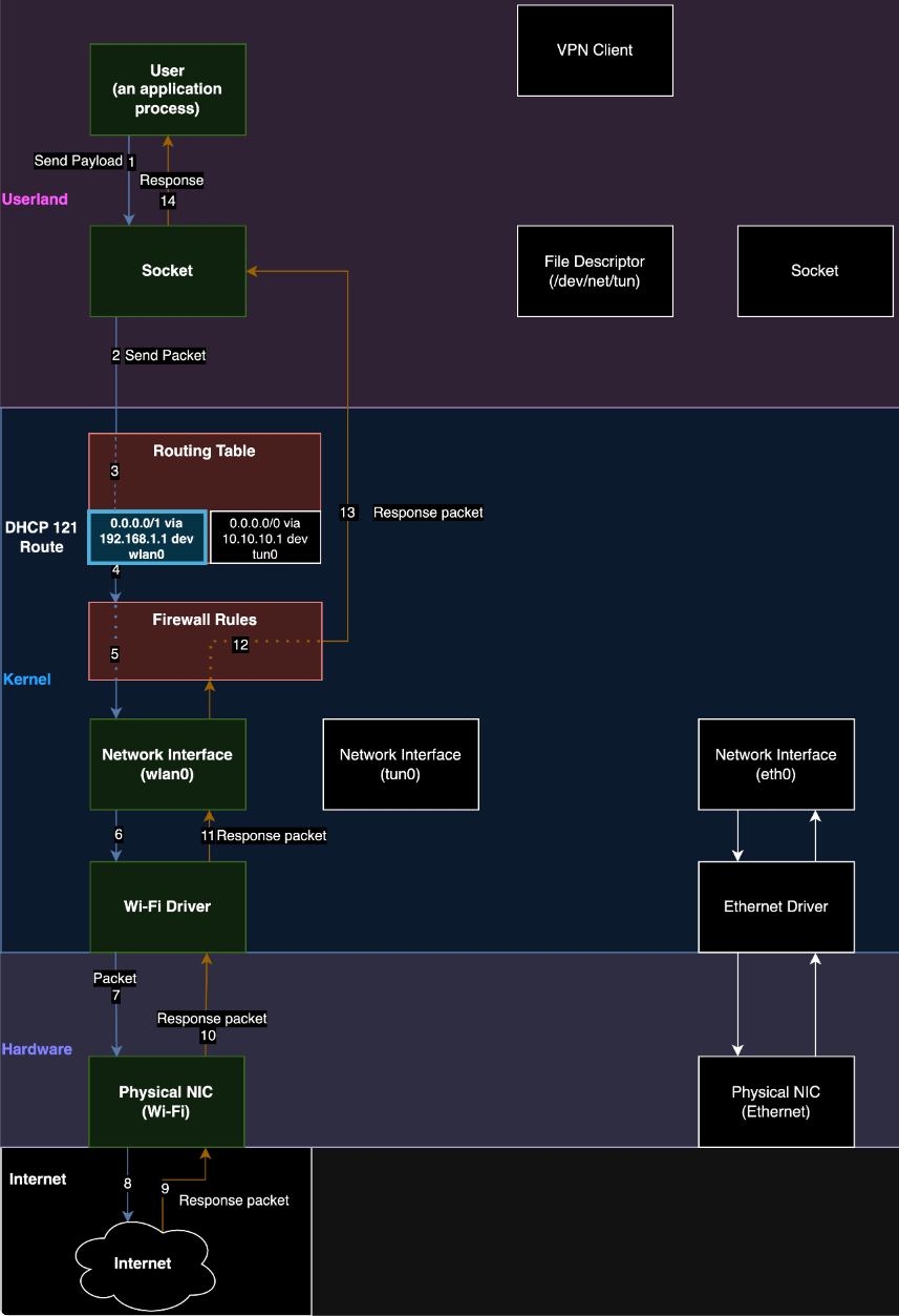 Злоумышленники устанавливают мошеннический DHCP-сервер, который изменяет таблицы маршрутизации так, что весь VPN-трафик направляется прямо в локальную сеть или вредоносный шлюз, никогда не попадая в зашифрованный VPN-туннель.