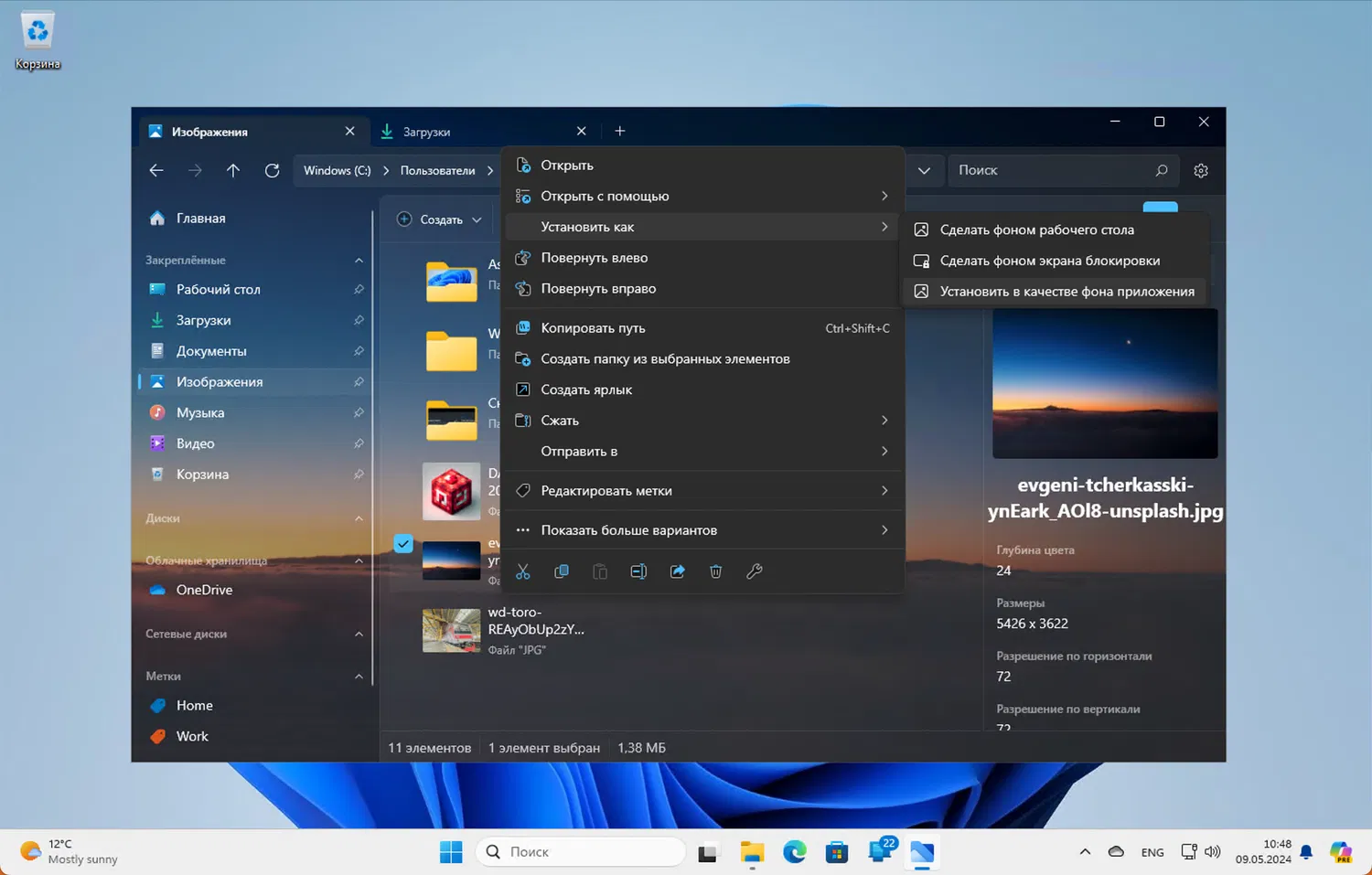 - Фоновые изображения: можно создавать пользовательские темы. Перейдите в "Настройки > Внешний вид" и нажмите "Фоновое изображение". В настройках есть возможность регулировать прозрачность фона. Также можно щелкнуть правой кнопкой мыши по любой картинке и выбрать "Установить как > Установить в качестве фона приложения приложения".