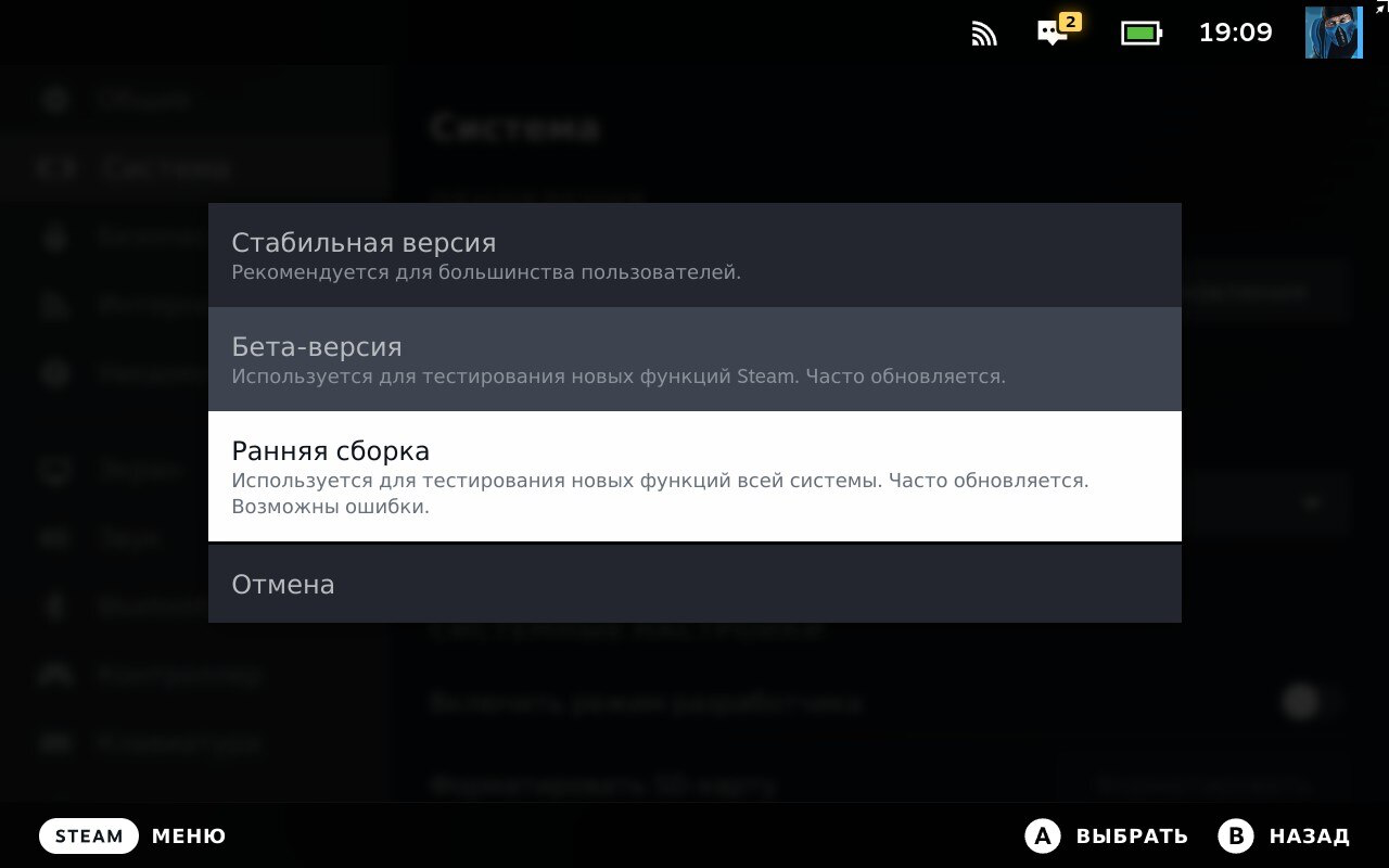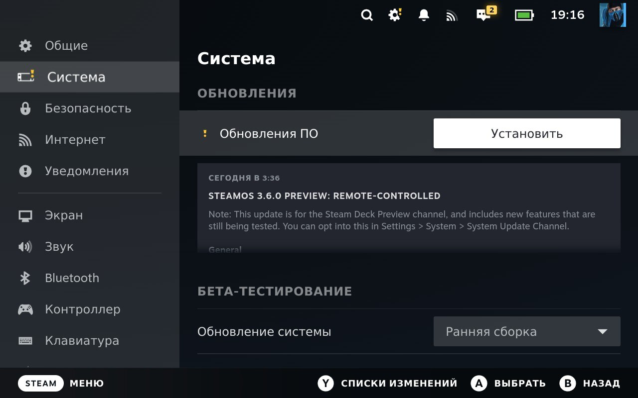 Новая версия SteamOS 3.6 доступна только на канале «Ранняя сборка» (Preview), для перехода на который необходимо вручную изменить настройки Steam Deck в разделе Steam > Система > Бета-тестирование. В выпадающем списке нужно выбрать «Ранняя сборка», после чего Steam Deck потребуется перезагрузить.