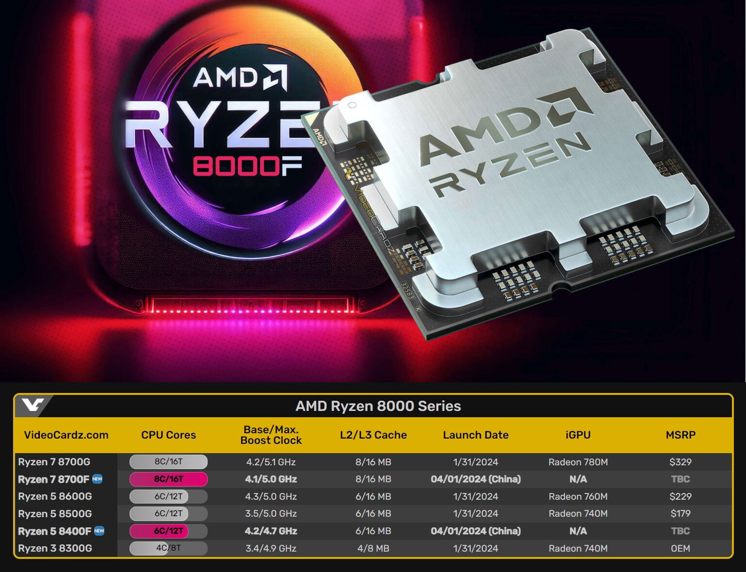 В этом году компания AMD представила нам две модели: AMD Ryzen 7 8700F и AMD Ryzen 5 8400F. Индекс «F» в названии говорит нам о том, что в этих процессорах нет встроенного GPU.