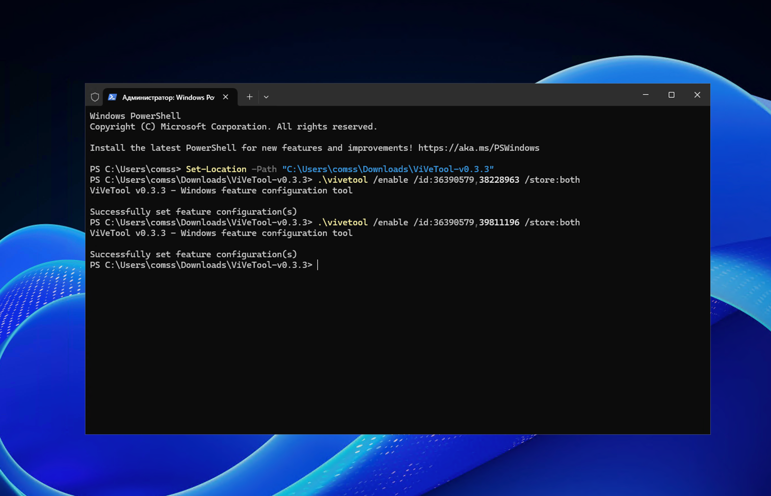 .\vivetool /enable /id:36390579,38228963 /store:both